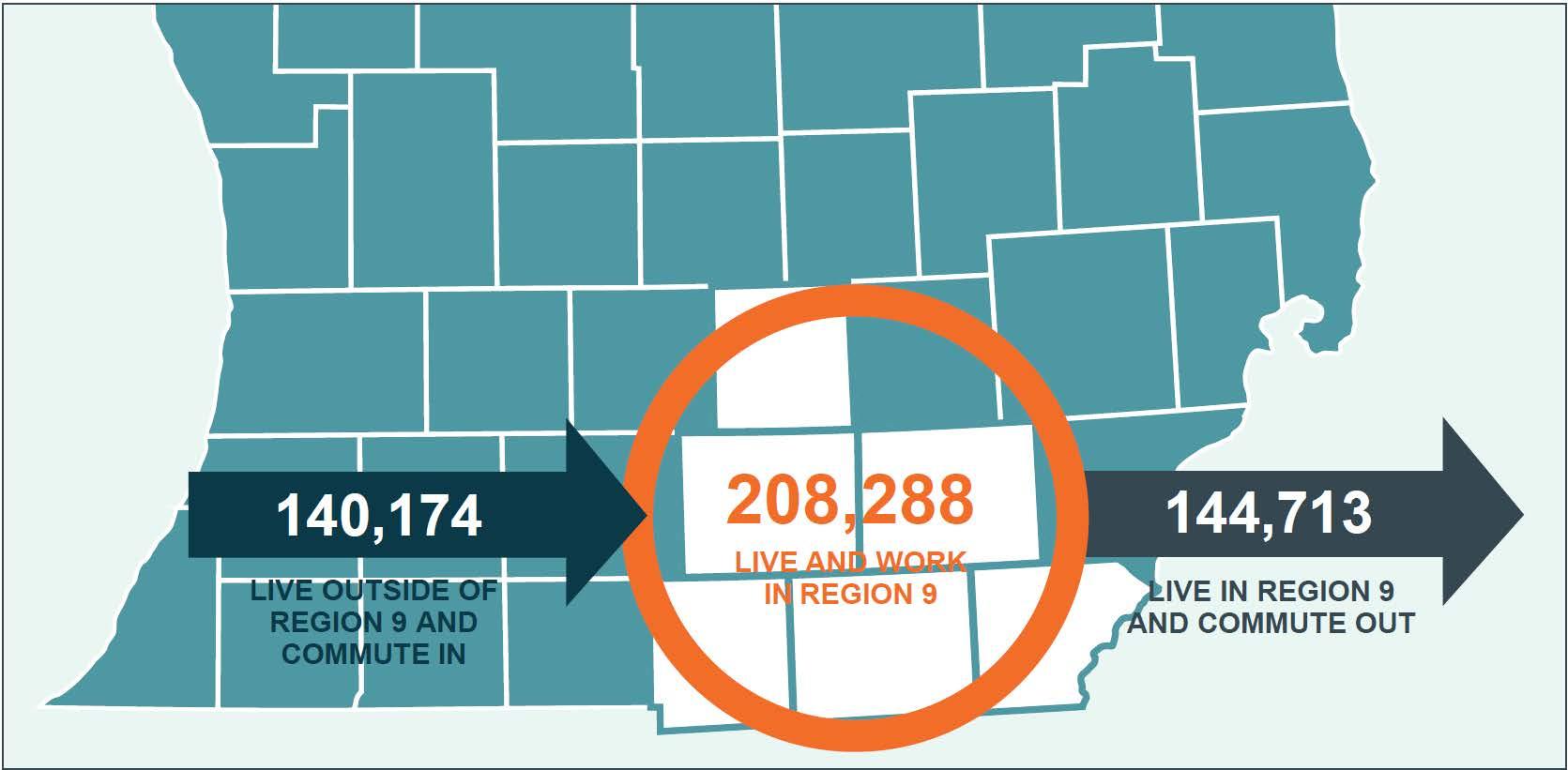 In 2019, Region 9’s workforce consisted of 353,001 residents. 208,288 (59.0 percent) of the residents lived and worked within Region 9, while the remaining 144,713 residents (41.0 percent) traveled outside of the region for work. Since 2017, the number of residents that traveled outside of the region for work decreased by 30,483 (17.4 percent) individuals from 175,196 to 144,713 outbound commuters.