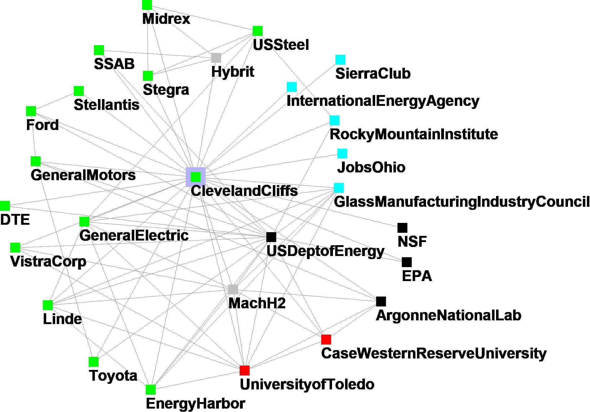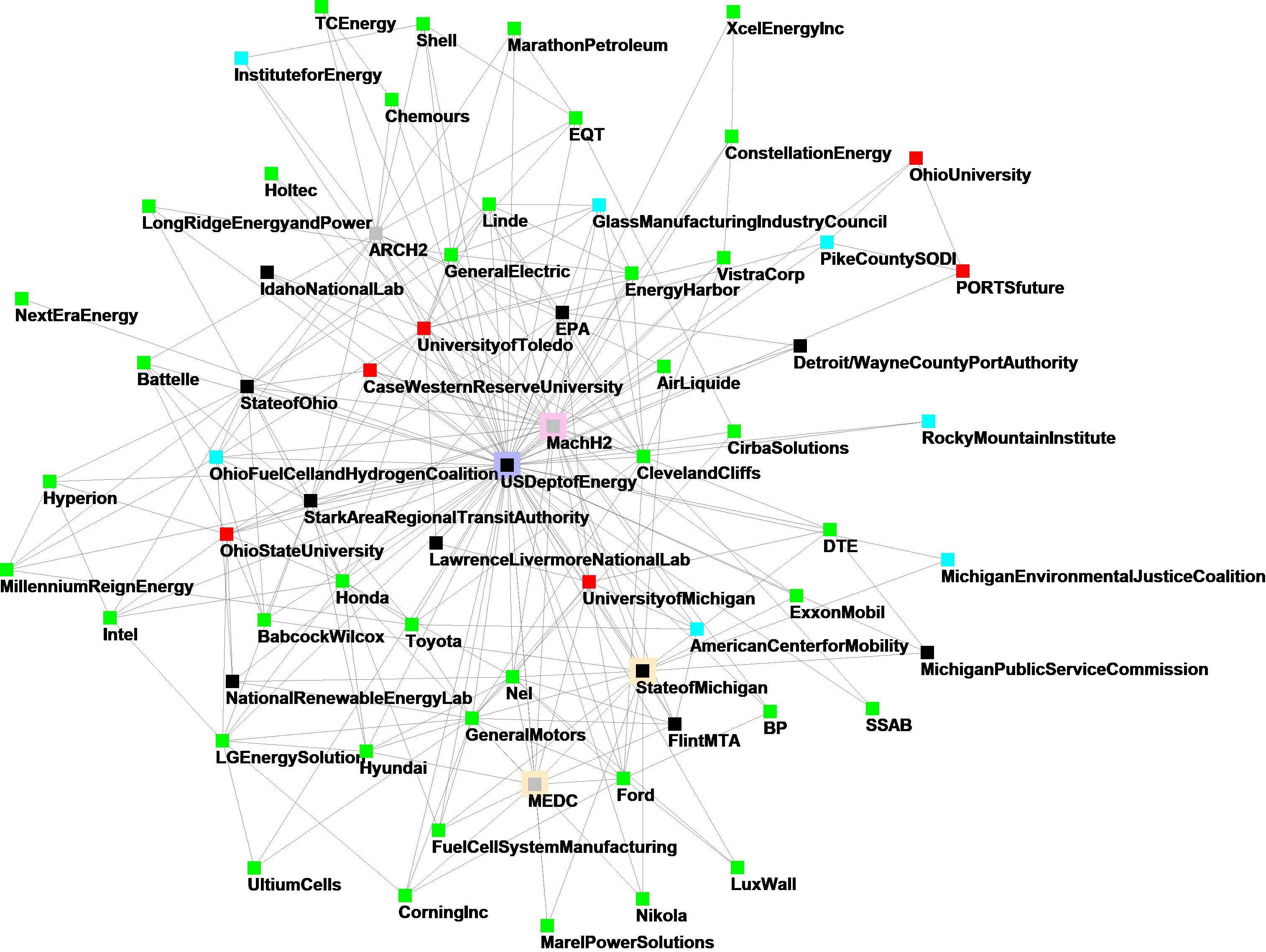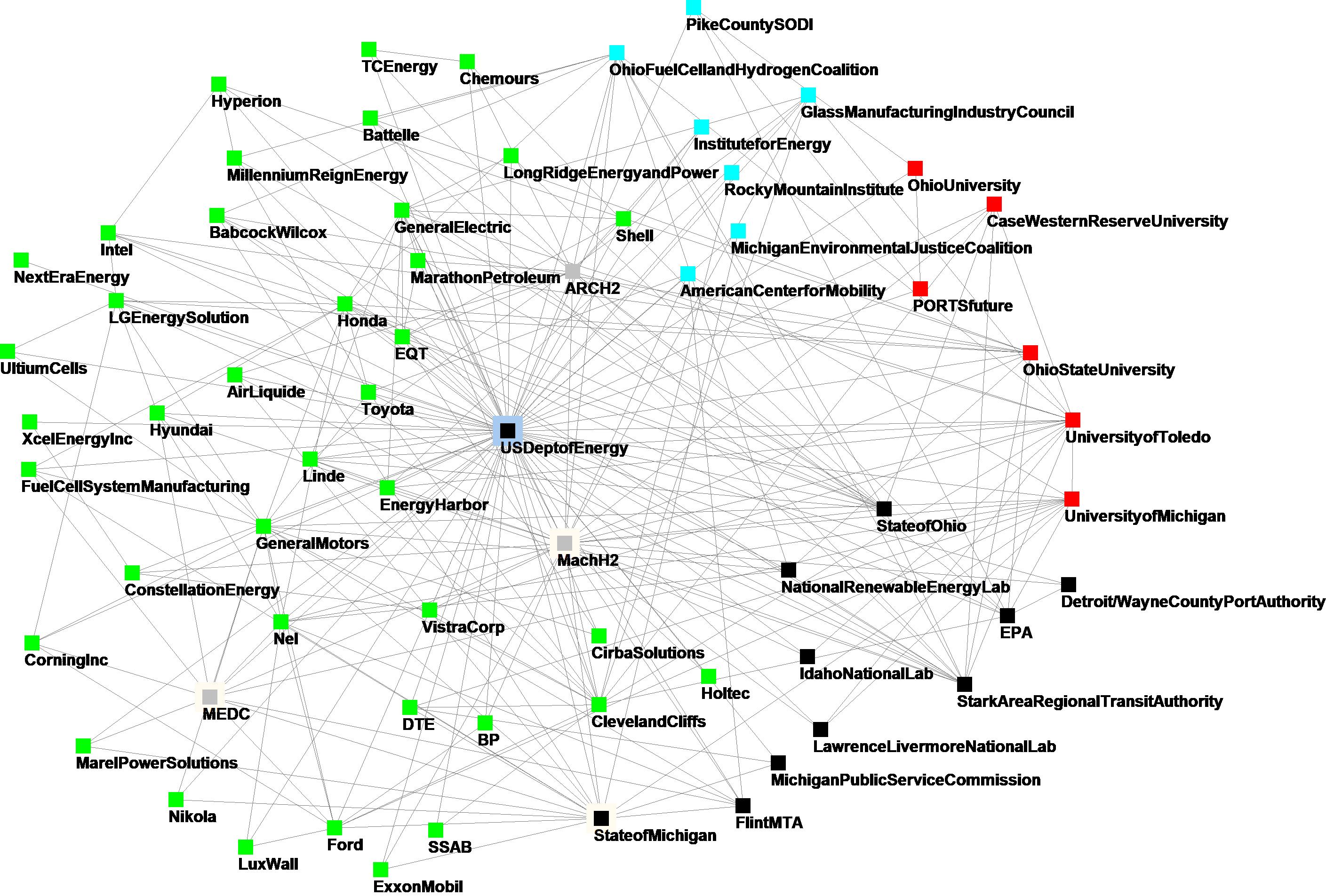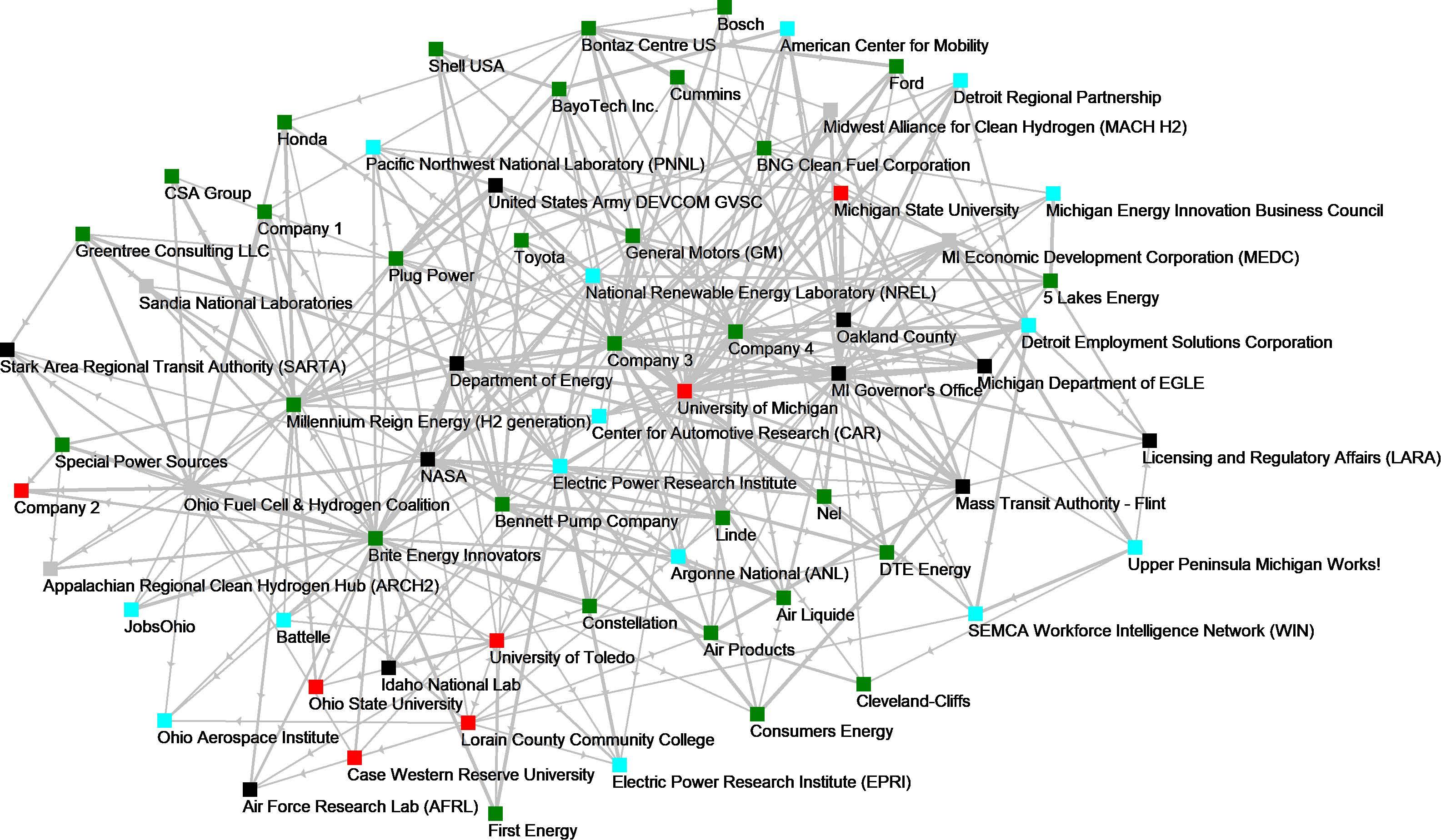 A social network analysis ecosystem mapping survey was conducted among hydrogen stakeholders in Michigan and Ohio. The survey yielded 51 responses from 38 unique organizations. The survey results provided another layer of depth and understanding of the ecosystem, with respondents indicating the degree of interactions with other organizations.