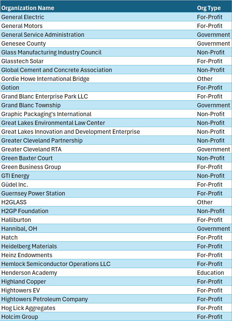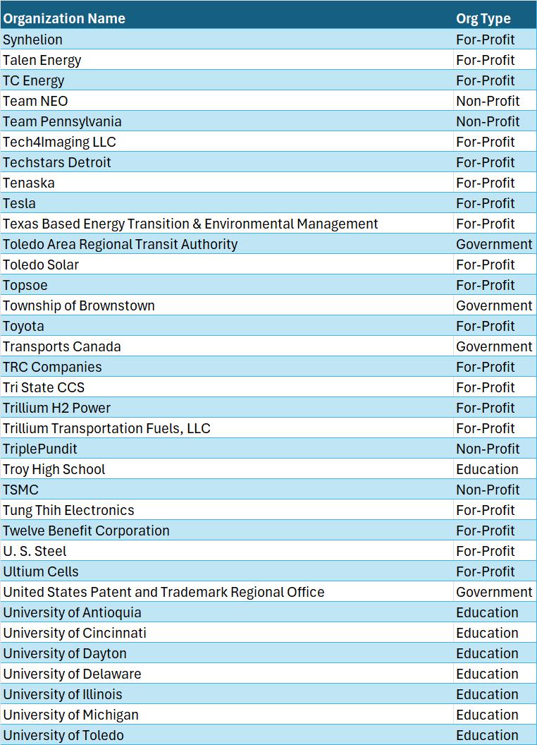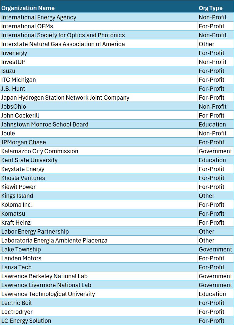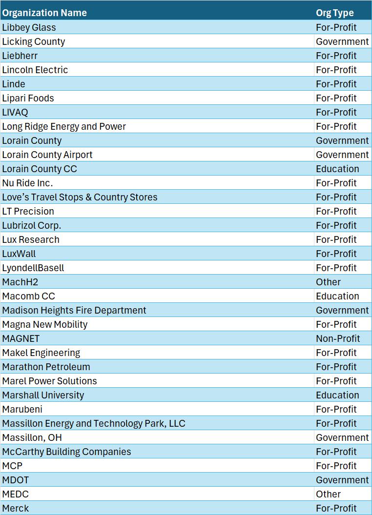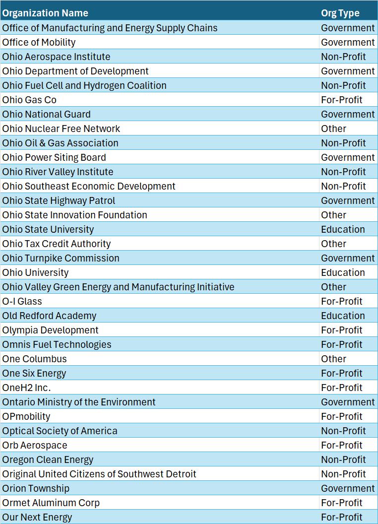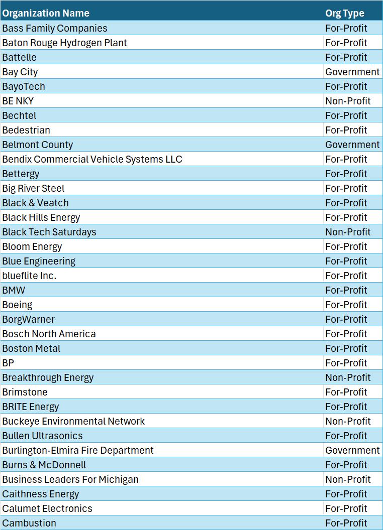 1. For membership organizations (ex: Ohio Fuel Cell & Hydrogen Coalition), all members were included in the list if the membership organizations were actively working in the hydrogen space.
