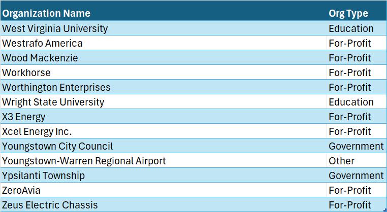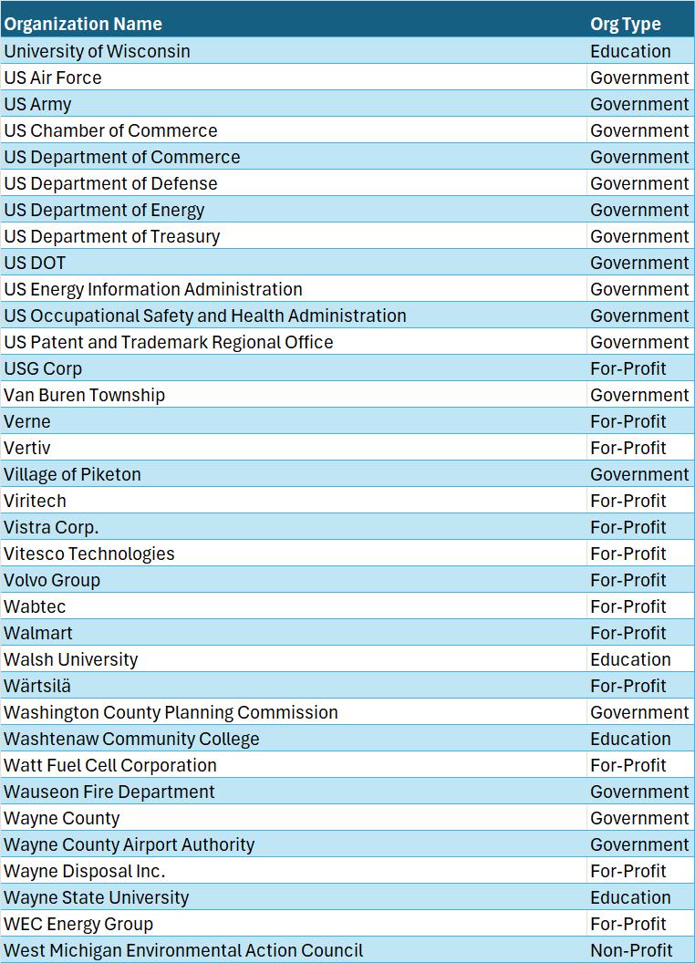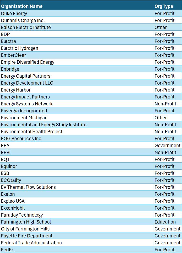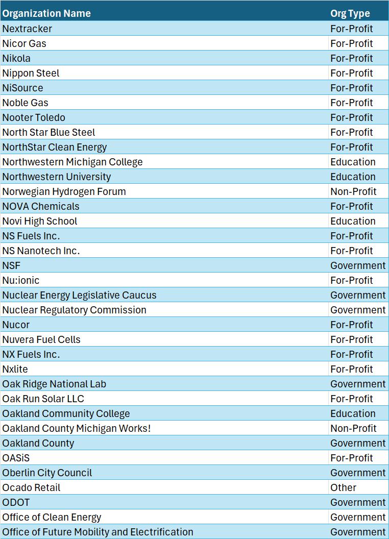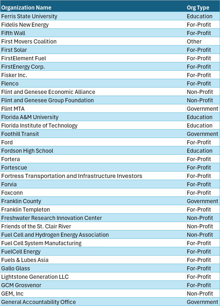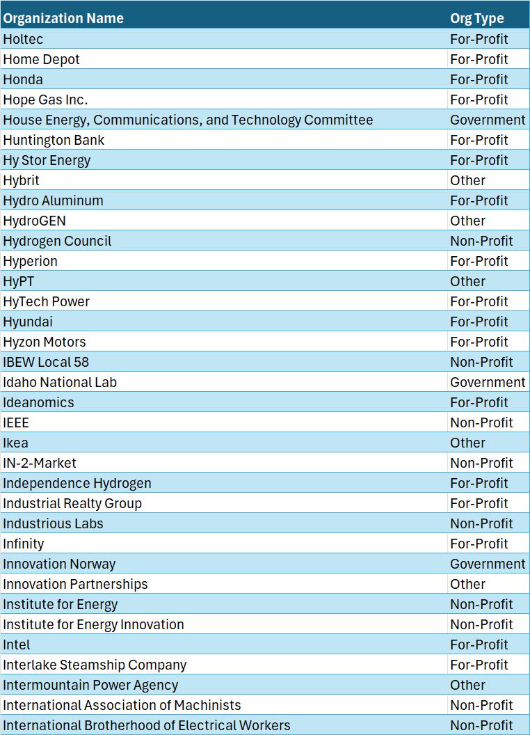 1. For membership organizations (ex: Ohio Fuel Cell & Hydrogen Coalition), all members were included in the list if the membership organizations were actively working in the hydrogen space.