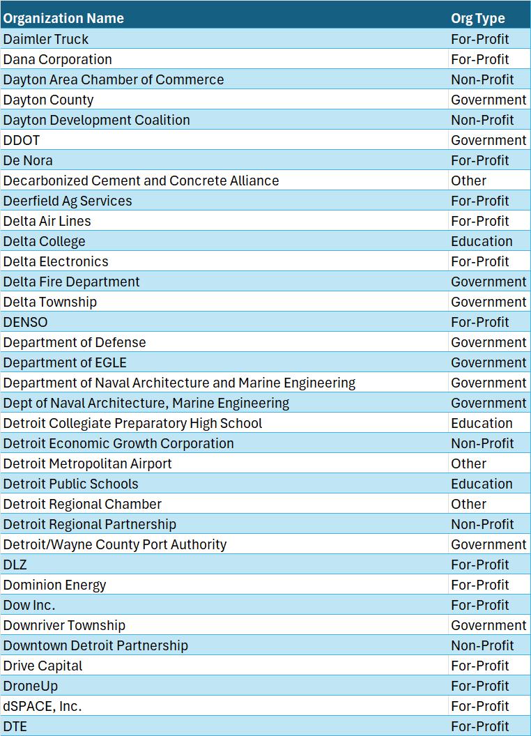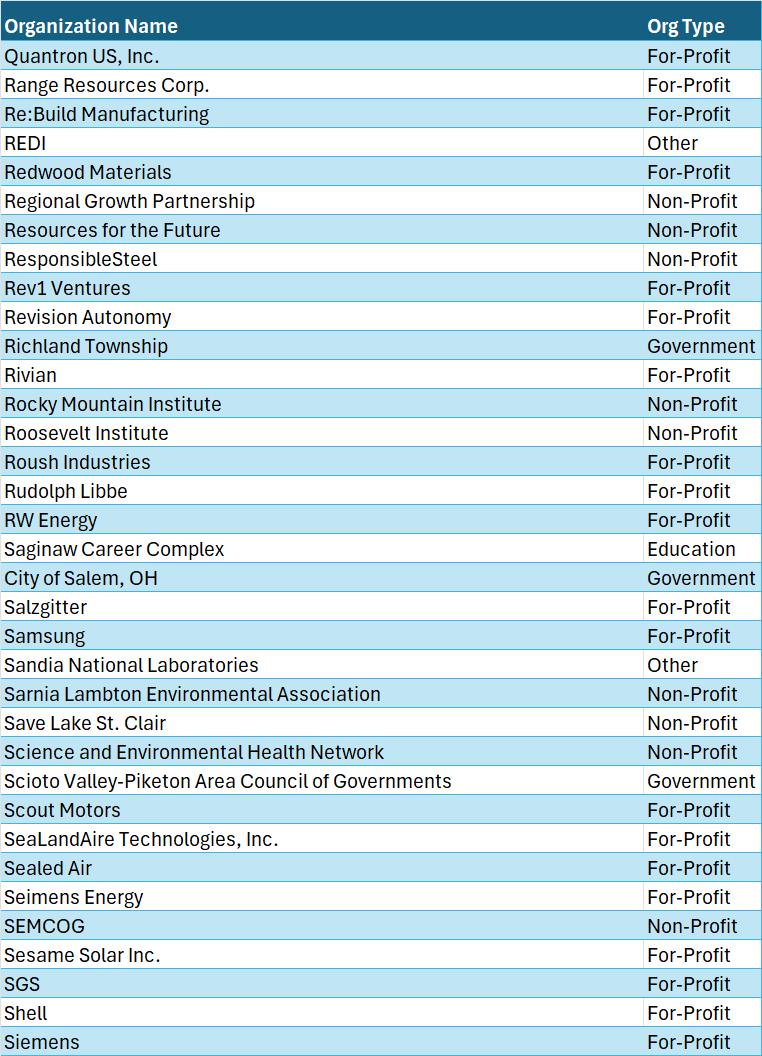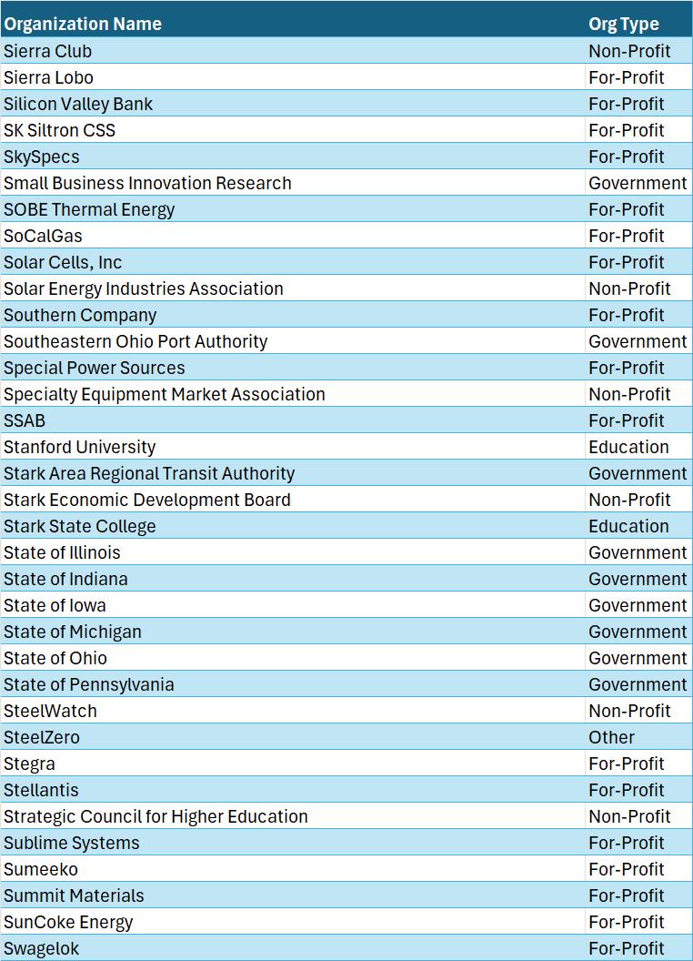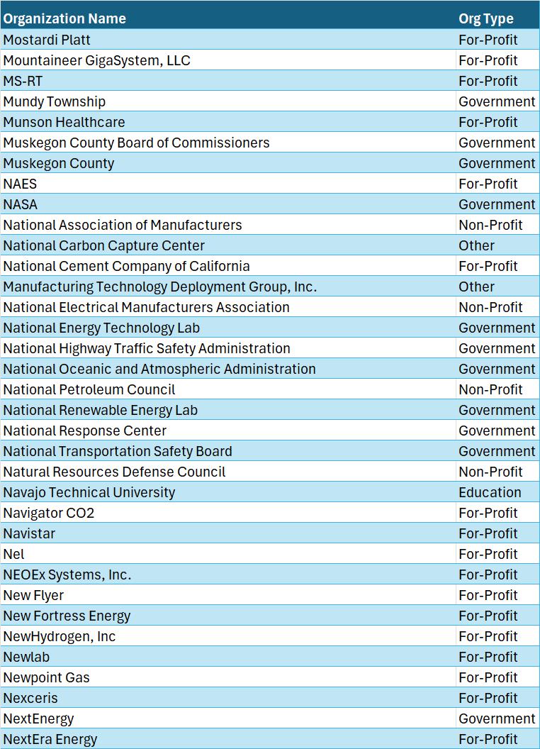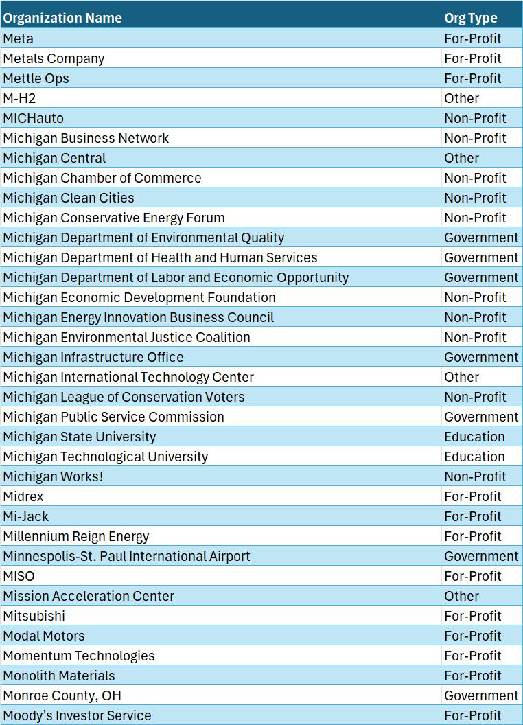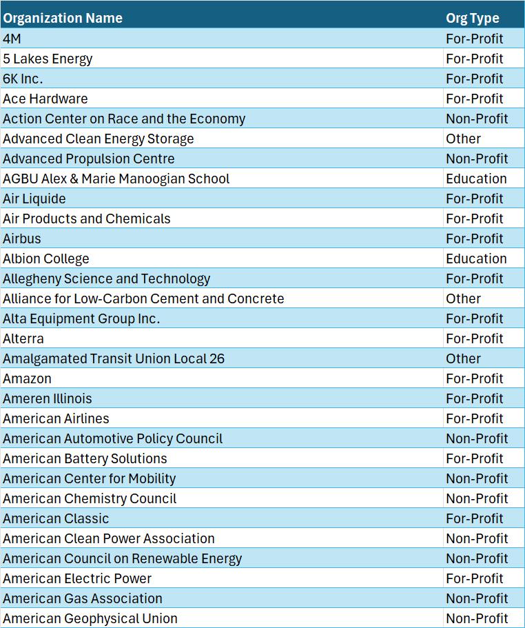 1. For membership organizations (ex: Ohio Fuel Cell & Hydrogen Coalition), all members were included in the list if the membership organizations were actively working in the hydrogen space.