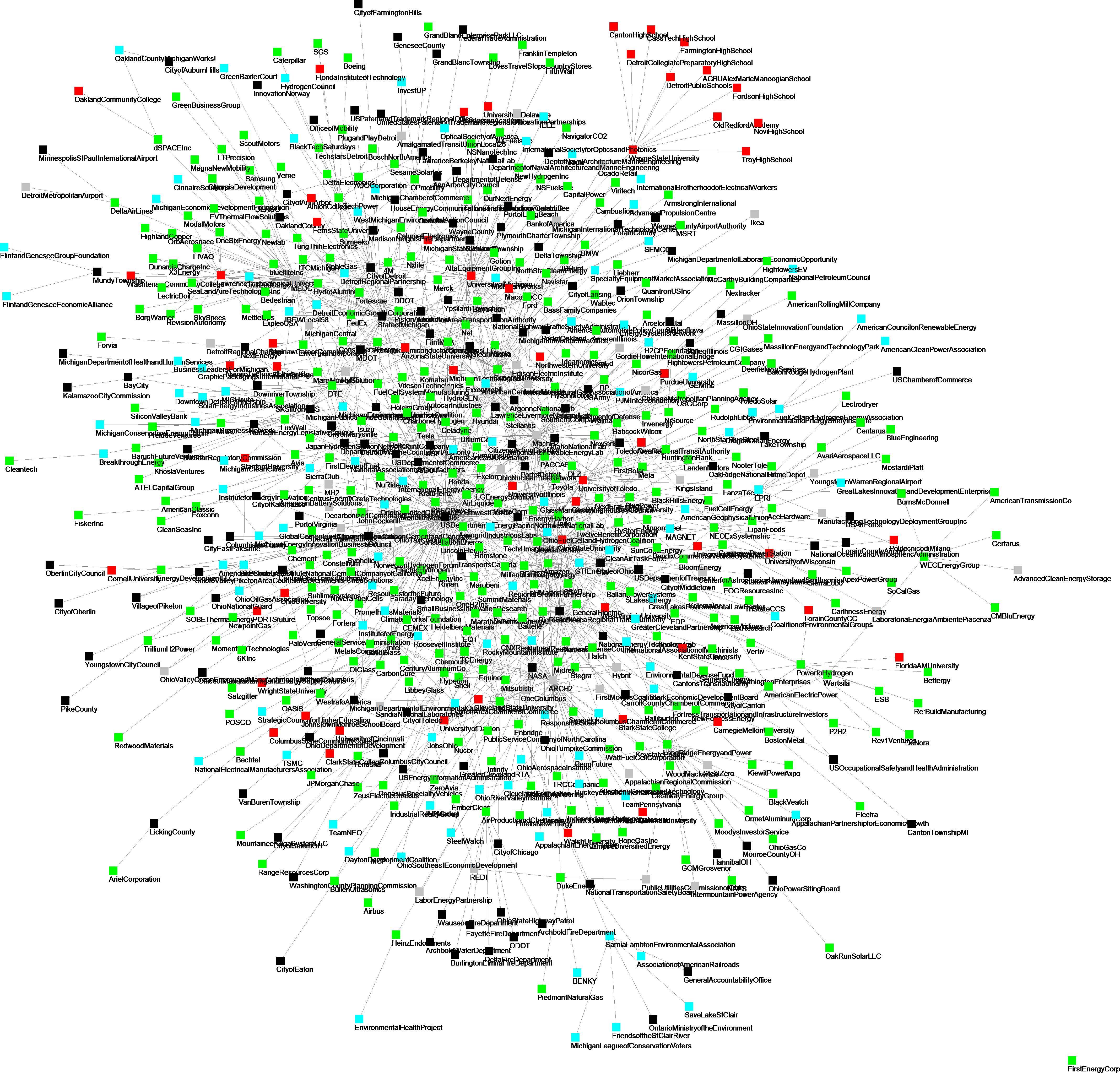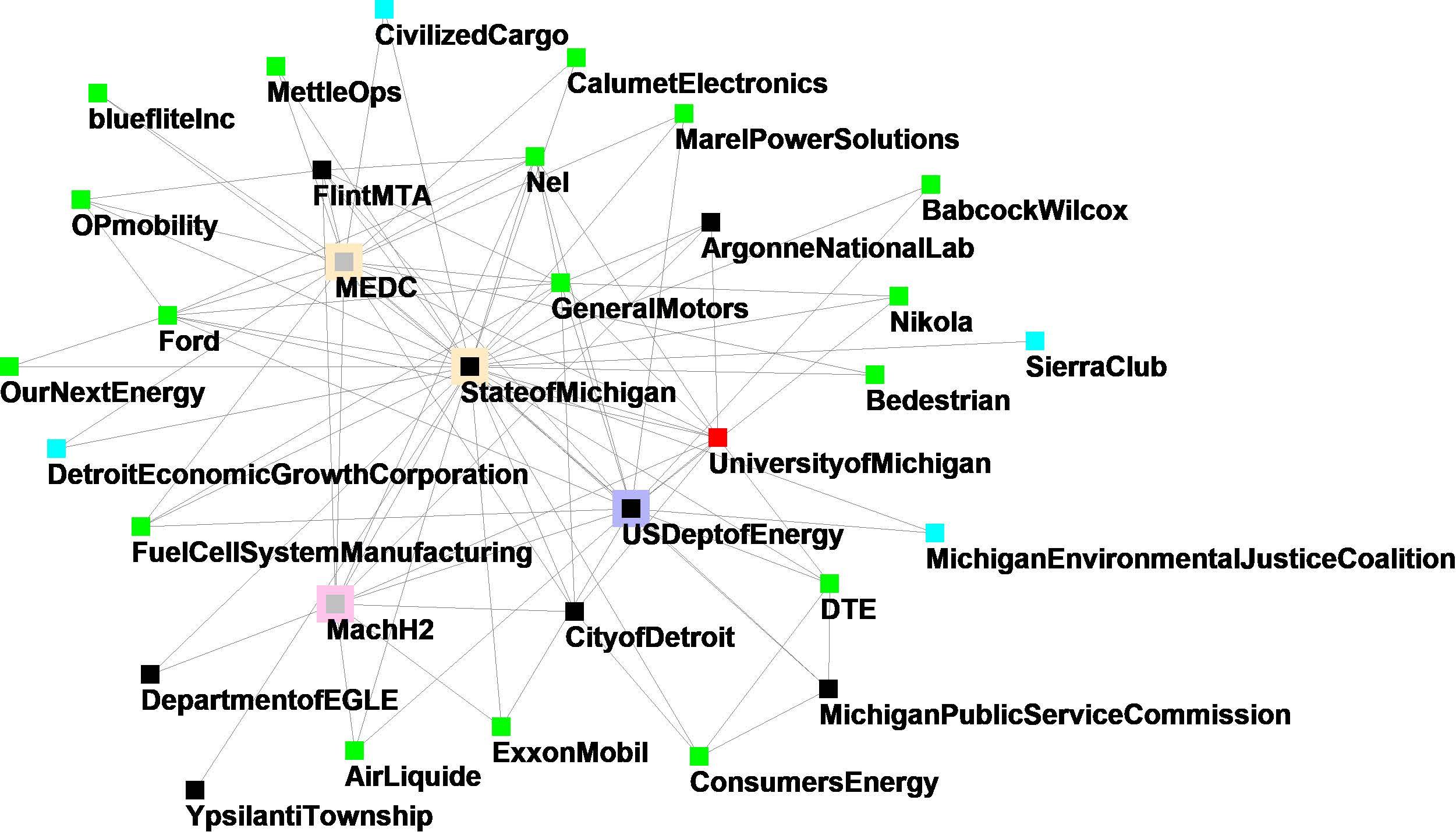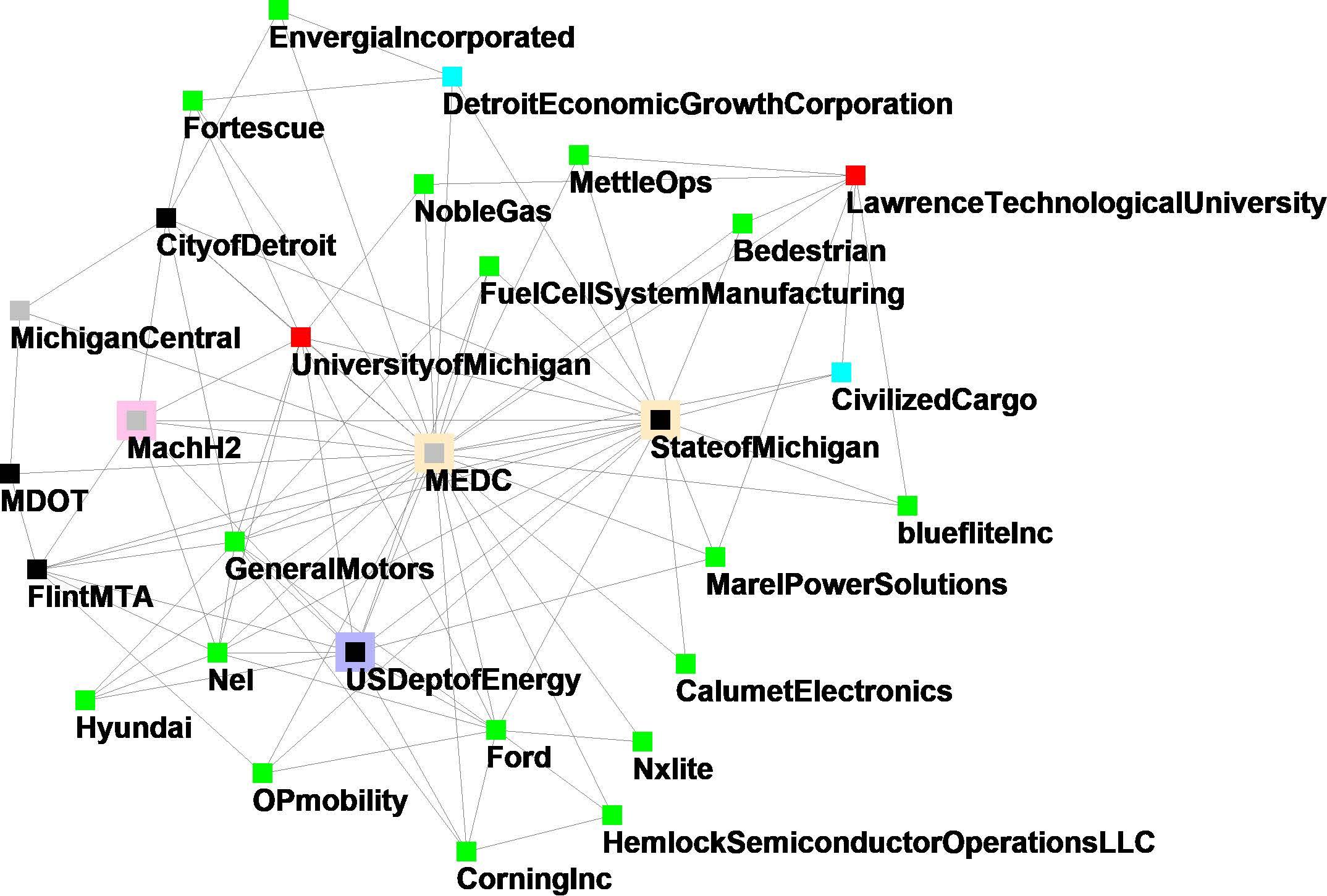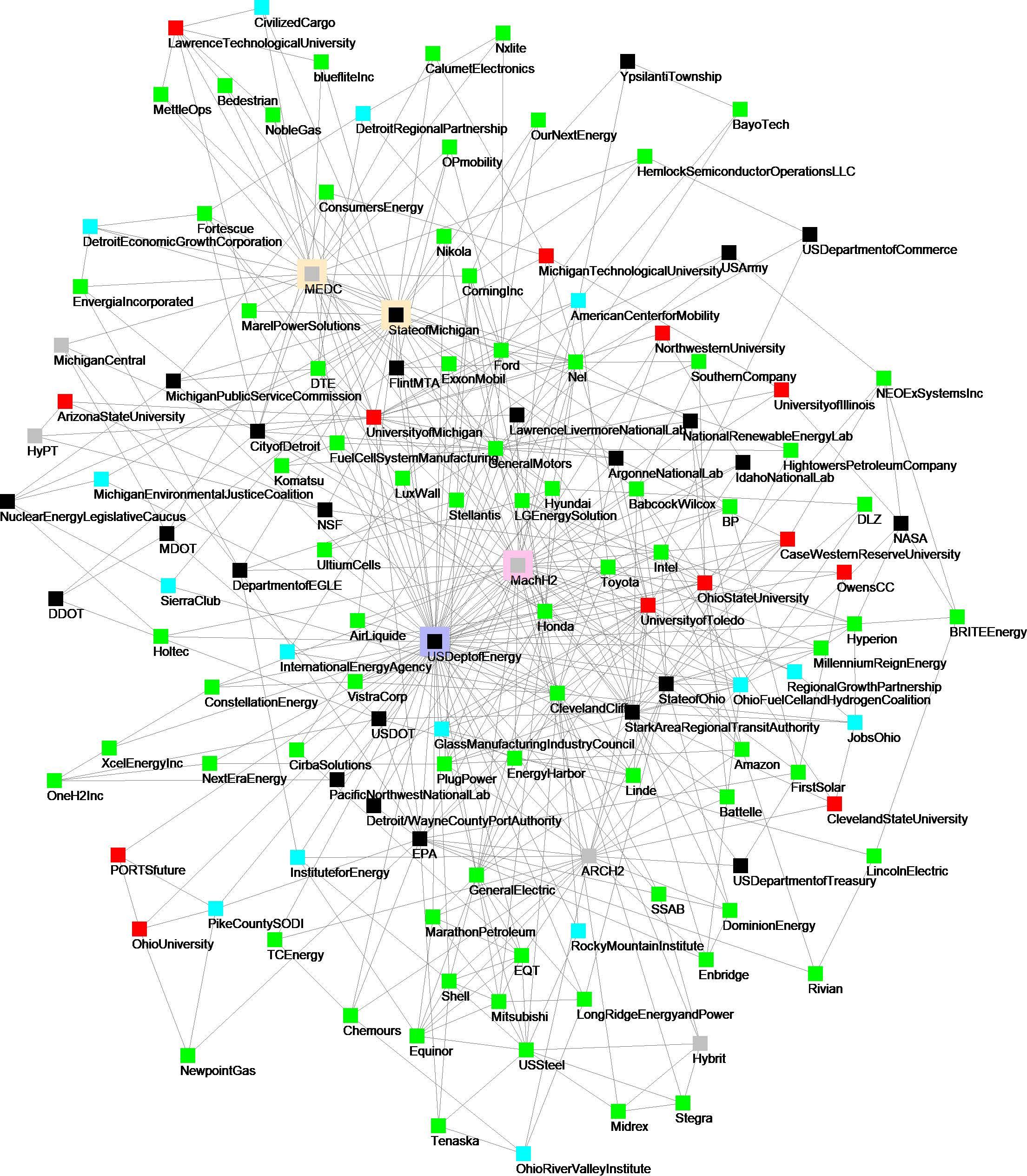 *Note, certain nodes, such as those for government entities or educational institutions, may include multiple departments. These nodes include any reference to internal departments of that entity and do not specify an office, department, or institute (e.g. MI Hydrogen initiative was included in the count for the University of Michigan.)