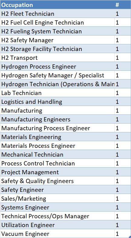 Among the top roles identified as having the greatest need for new or up-skilled talent in the next 3-5 years were H2 Technicians, Safety Managers and Process Engineers. While several organizations identified similar needs in the top three roles, there was considerable variety in the remainder of responses. A total of 56 unique job titles were provided from respondents, indicating a diverse range of needs. Many of these titles can be characterized as either engineering or technician-related in nature. The full responses are shown in Table 1.