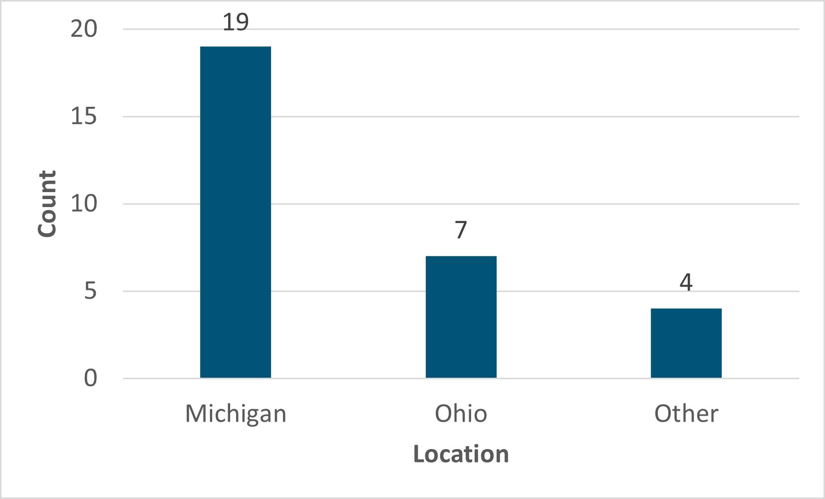 As shown in Figure 1, a total of 31 responses were submitted, representing 30 unique organizations. Among all respondents, 61.2% indicated their employer is based in Michigan, while 22.6% are in Ohio and 12.9% from a different state. This cross-section of industry and academic representation helps provide a clear view of the current skills needs and training for the future.