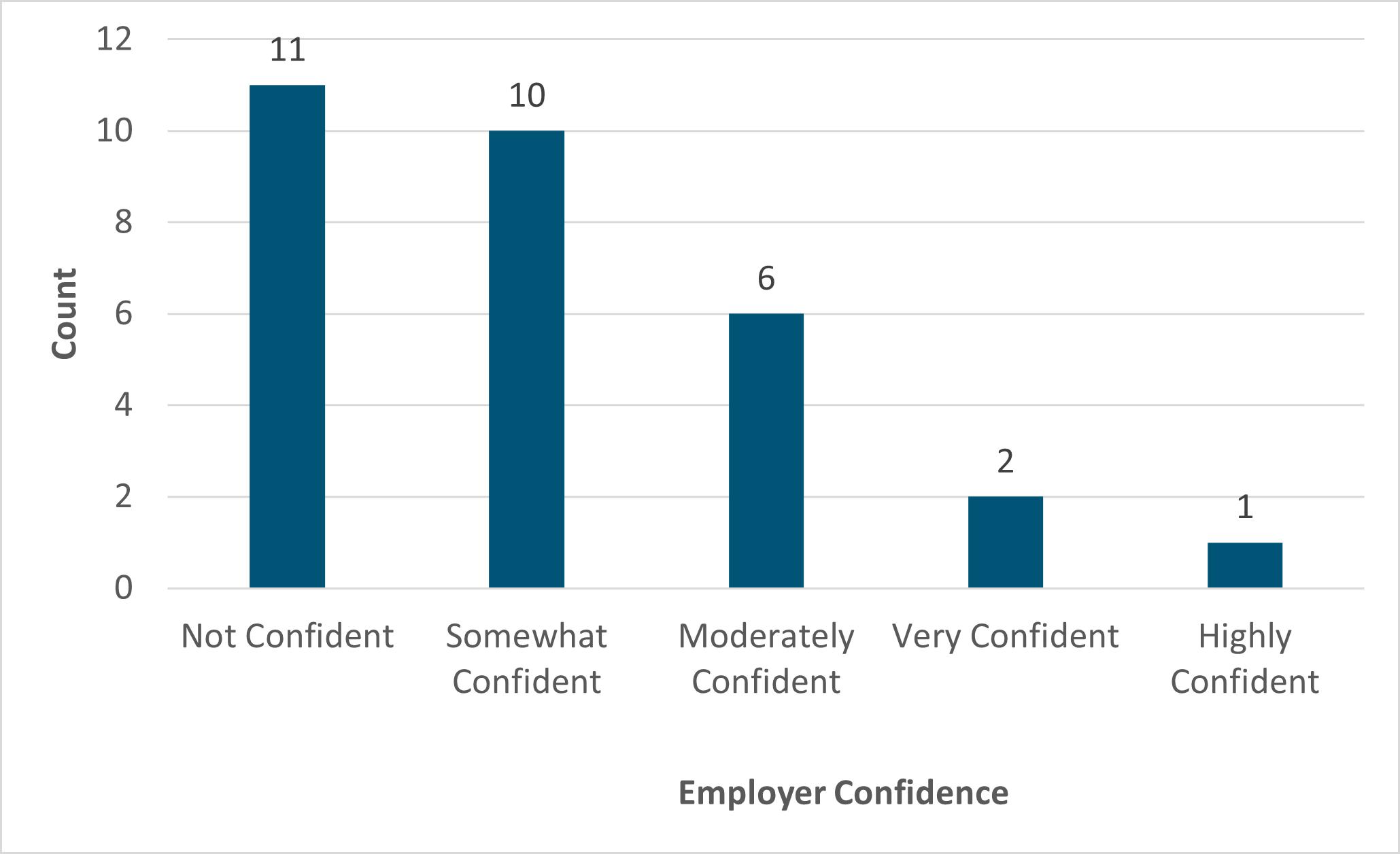 As shown in Figure 3, the majority of participants (70.0%) indicated little or no confidence that current educational programs are adequately preparing workers for roles in hydrogen. This finding suggests an opportunity to review existing programs and better align their outcomes with industry needs. Employer feedback will be vital to adequately inform new curriculum to address these needs.