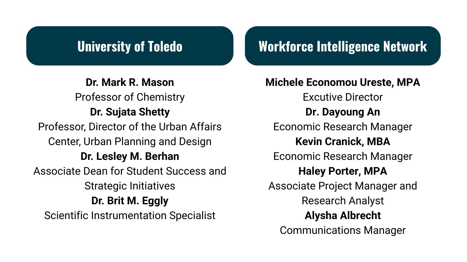 However, opportunity comes with an urgent challenge. Our research, which includes direct feedback from employers across both states, has illuminated a growing concern: the talent gap. While the technical applications for hydrogen are diverse and rapidly expanding, the current talent pool is not yet equipped with the specialized skills needed for this evolving industry. This significant achievement is a direct result of the inter-team coordination and invaluable contributions made by both the University of Toldo and the Workforce Intelligence Network (WIN), whose project contributors are listed below.