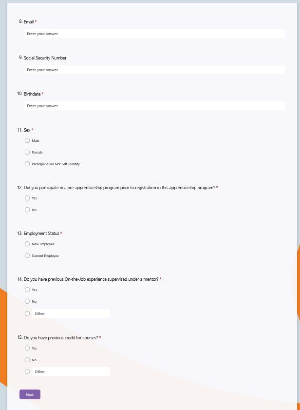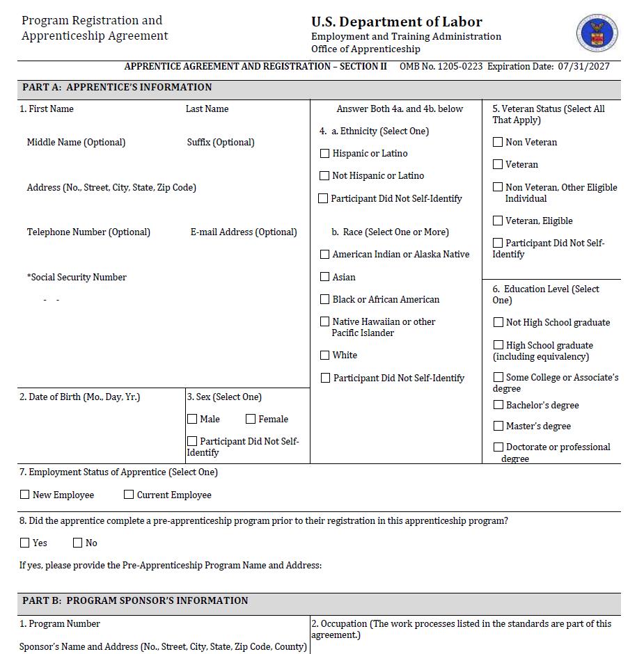 Include all personal and demographic information requested for apprentice registration with the US DOL.