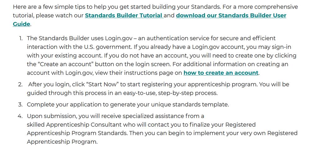 https://vimeo.com/742727965/a9a5745a77 Once you create your account via Login.gov you will be able to enter the Online Standards Builder.