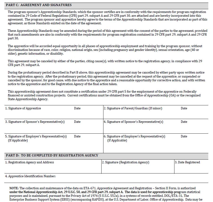 • Ensure that all apprentices are underwritten apprenticeship agreements that incorporate the standards' entirety, including the requirements of 29 CFR § 29.5 and 29 CFR § 29.7.