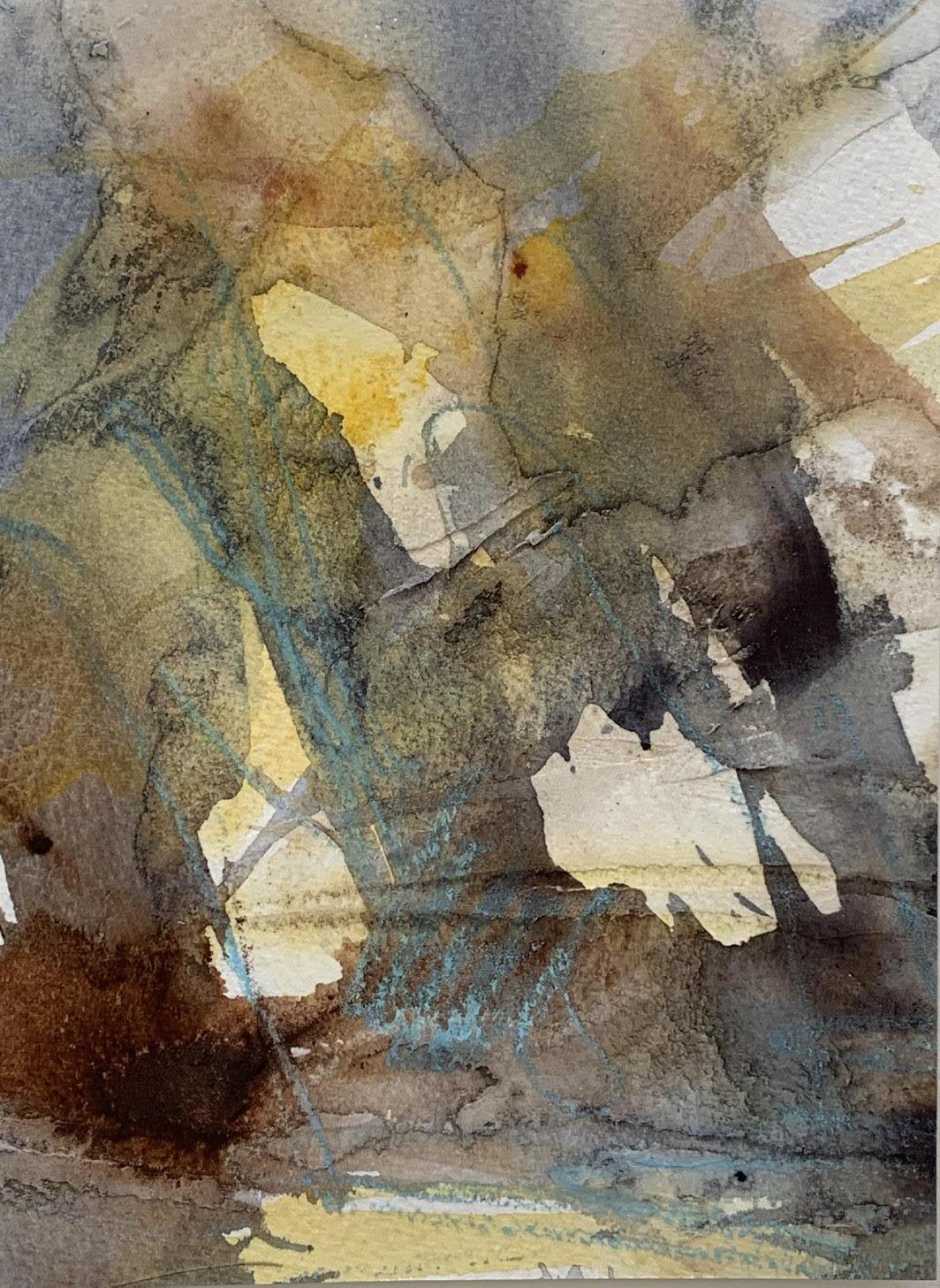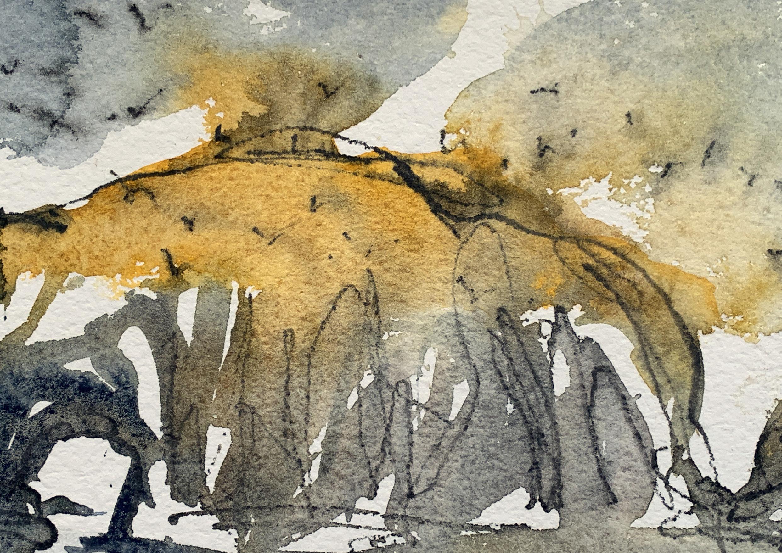 Van Heemstra – a walking artist who experiences her landscapes on the move - urges us out and into this lost world of wind, rain, storms. ‘I don’t like still, summery days with blue skies,’ she tells me. ‘Those are not the days when I feel truly alive’. Instead, the ideas and images that seeded this exhibition came as she walked with her sketchpad, paints, palette, pens and pencils, into the most remote corners of Scotland, in the most dramatic of weathers.