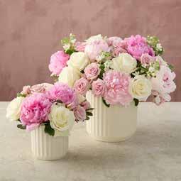 Brighten a desk with this charming arrangement of citrus blooms. Soft peach roses and pale yellow tulips are paired with goldcrowned daffodils, ‘mojito’ hydrangeas, and touches of geranium. Displayed in a ceramic matte white vase.