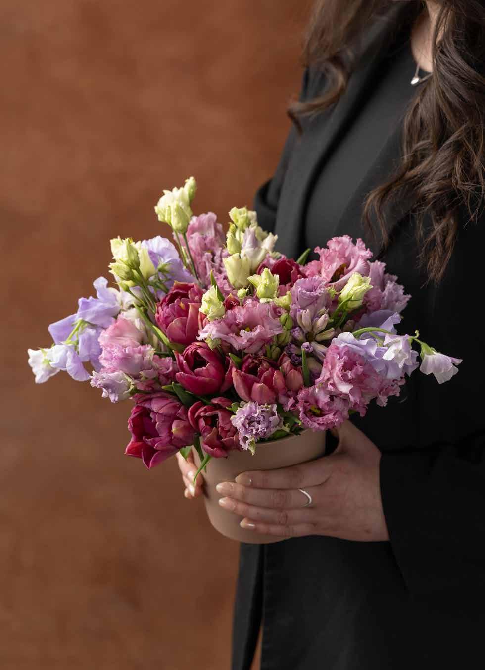 This eye-catching collection of seasonal florals offers plumcolored double-blooming tulips tucked among fragrant stems of lilac hyacinth. Ruffled pale grape lisianthus pairs perfectly beside stems of lavender sweet pea, displayed in a matte warm taupe vase.