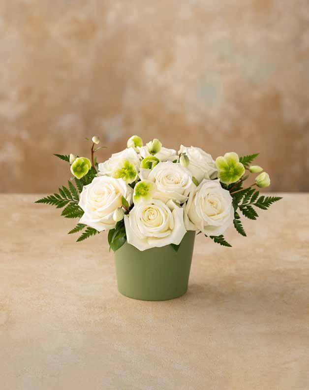 A perfect dose of beautiful blooms. Here, pristine ‘playa blanca’ roses are carefully arranged with crisp bells of helleborus and verdant fern fronds in a basil-green vase.