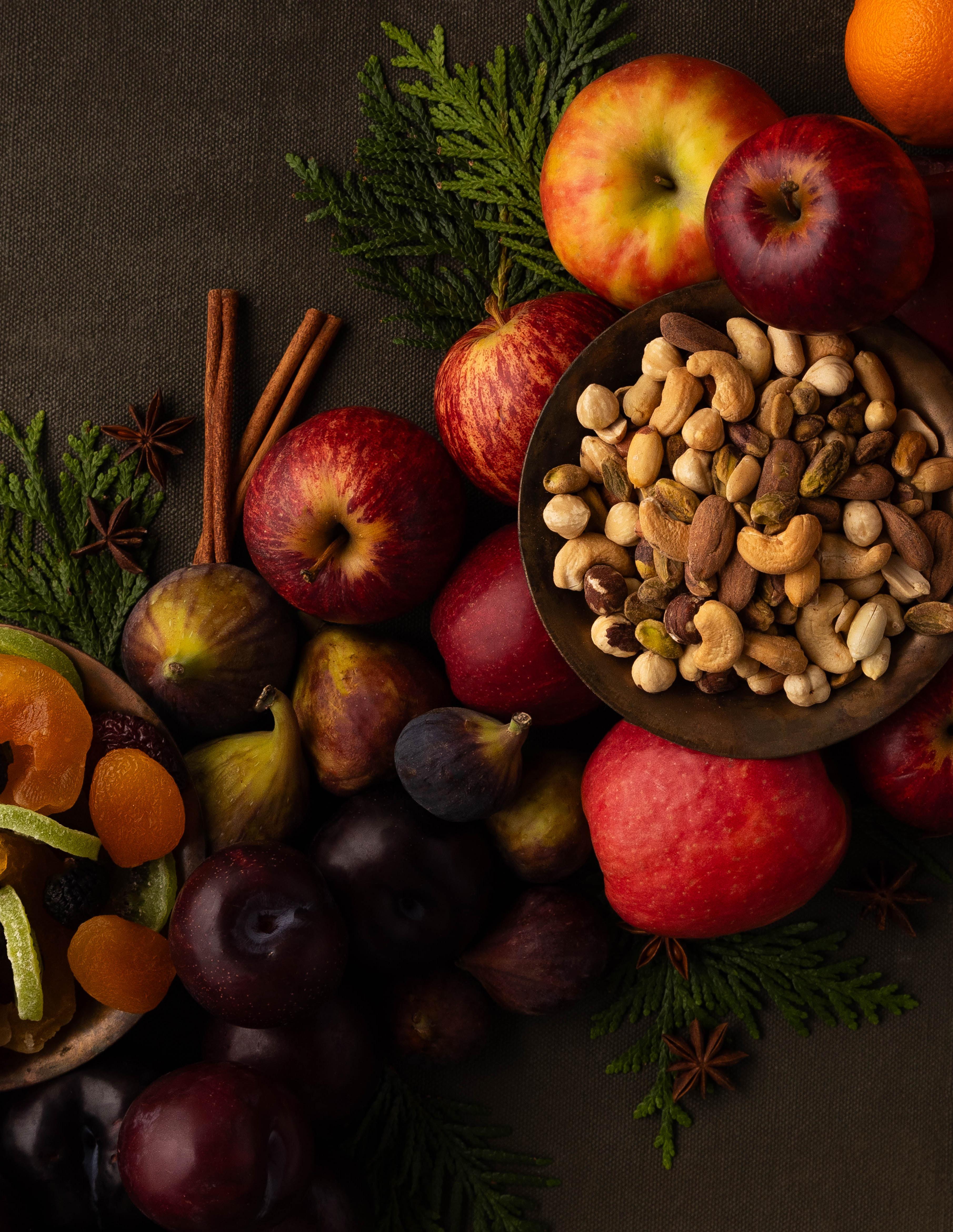 As fresh as it is beautiful, this classic basket is just right for holiday gifting. The colorful collection includes a generous assortment of seasonal fruit accompanied by a block of Plymouth cheddar cheese and mixed nuts and dried fruit from Gräem Nuts and Chocolate. Dressed with verdant evergreens and presented in our luxury gift crate.