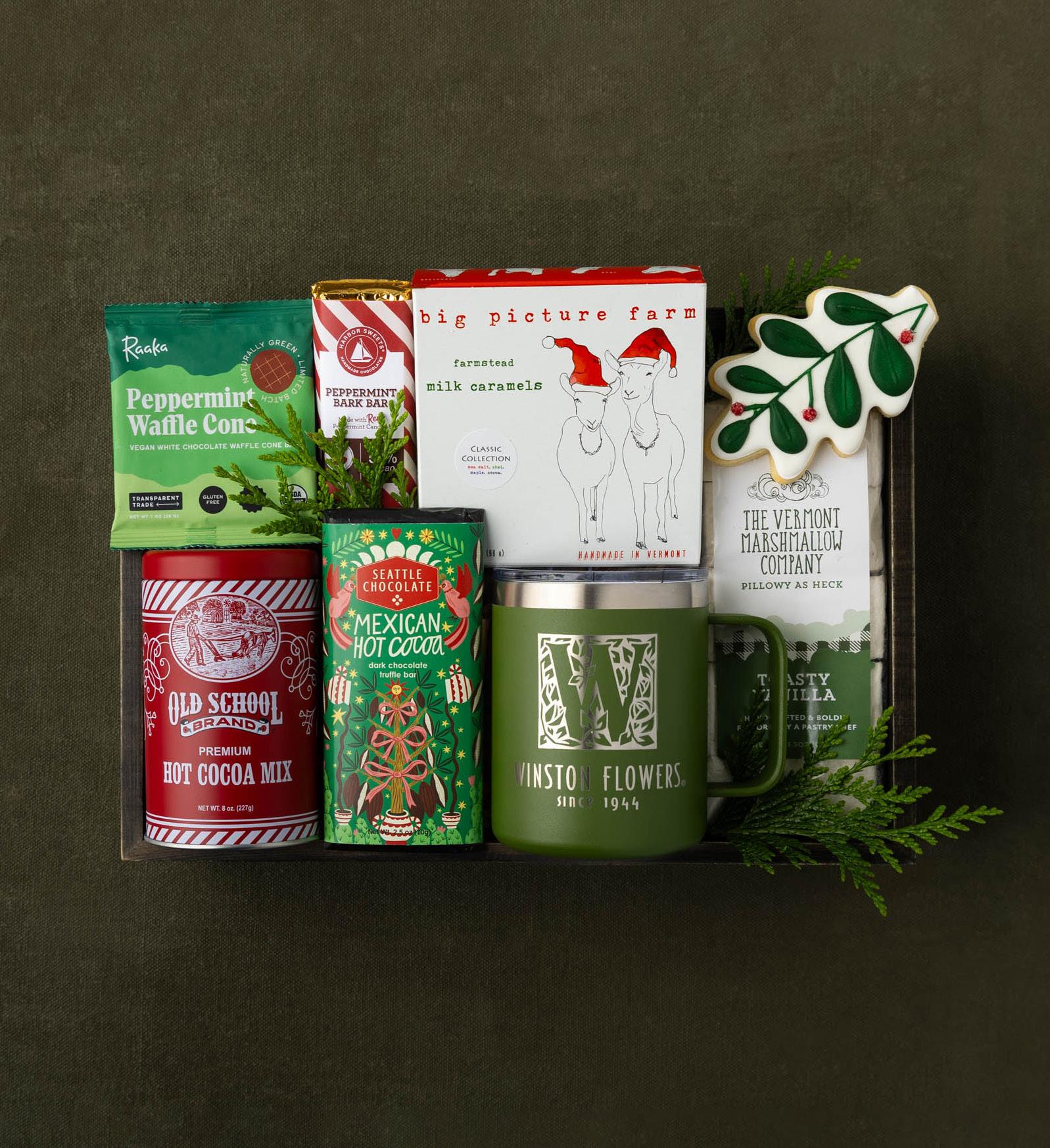 Cozy up for a soul-soothing winter afternoon with this warming collection of sweets and treats. Make a steaming cup of Old School Brand’s Hot Cocoa Mix topped with vanilla marshmallows from Vermont Marshmallow Co. and served in an exclusive Winston Flowers mug. For sweet snacks, enjoy a Mexican hot chocolate bar from Seattle Chocolate, peppermint waffle cone bar from Raaka, a peppermint bark chocolate bar from Harbor Sweets, caramels from Big Picture Farm, and a decorated sugar cookie from Three Hundred Fifty. All displayed with fresh winter accents in our classic gift crate.