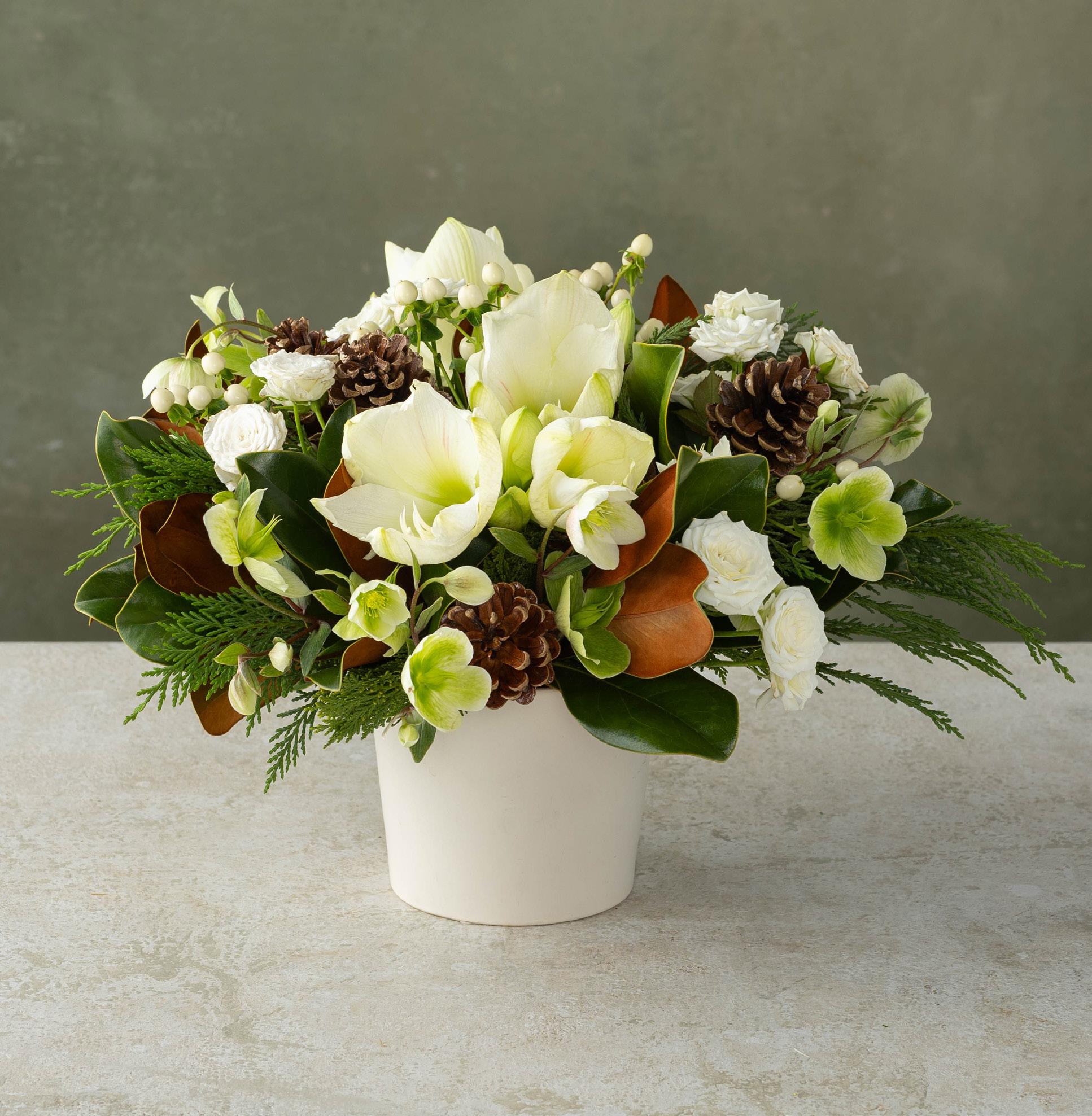 This lavish display of snowy blooms calls to mind memories of the holidays spent mountainside. Lush Dutch tulips bloom beside powder-white spray roses, stems of frost-colored amaryllis, and icy hypericum berries. Framed by an abundant mix of wintry textures, including magnolia leaves and pine cones, in a sleek ceramic pot.