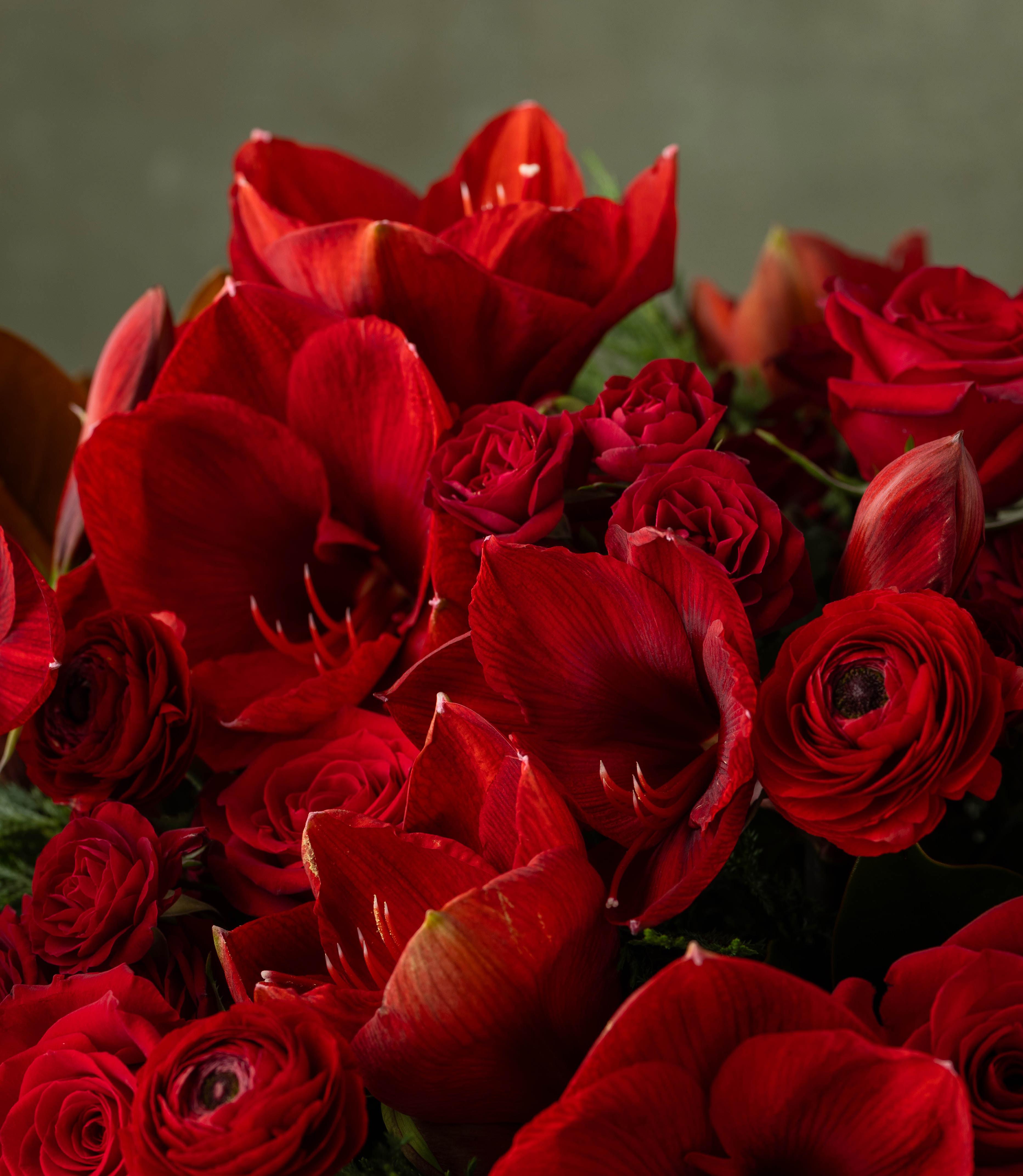 Deck your halls in holiday style with an eye-catching arrangement of rich red blooms. Trumpet-shaped amaryllis blossoms bloom alongside silky crimson ranunculus, classic red roses, clusters of spray roses, and verdant helleborus. Complete with bunches of berries and fresh seasonal greenery in a pine-hued vase.