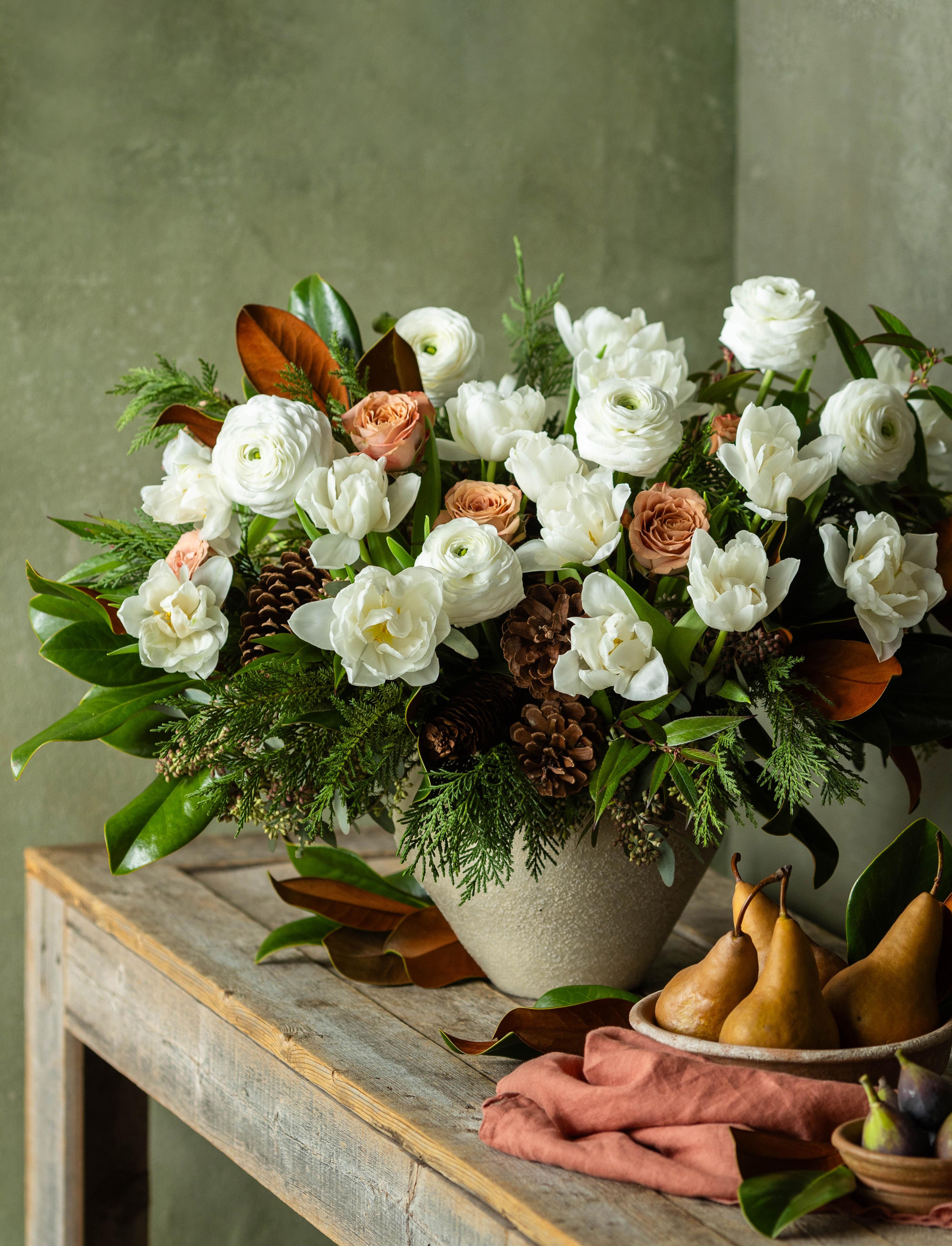 Filled to the brim with wintertime favorites, this enchanting design features lush cinnamon roses tucked between double-petaled tulips and stems of pristine ivory ranunculus. Loosely arranged with cascading winter greenery, native pine cones, two-toned magnolia, and seeded eucalyptus in a textured, natural vessel.