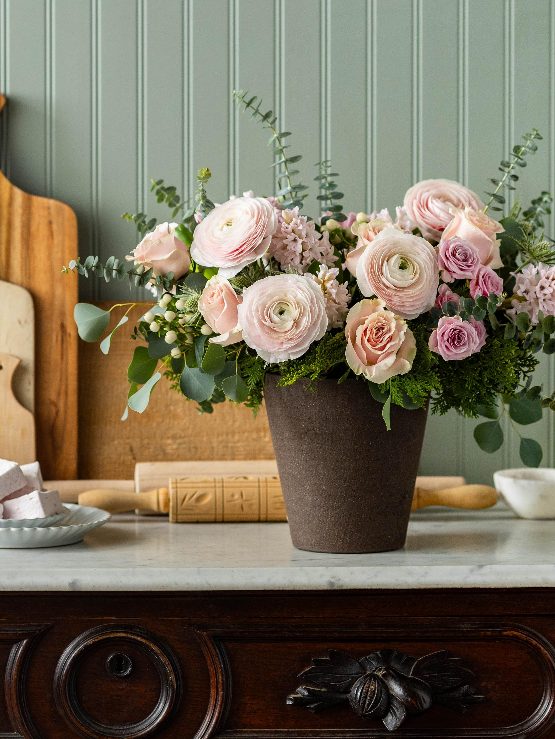 This glowing set of blooms brings a welcomed bit of sunshine to short winter days. Ethereal ‘Hanoi’ ranunculus blossoms float beside soft stems of hyacinth and two varieties of silky specialty roses. Finished with accents of white thistle and eucalyptus in an earthy brown vase.