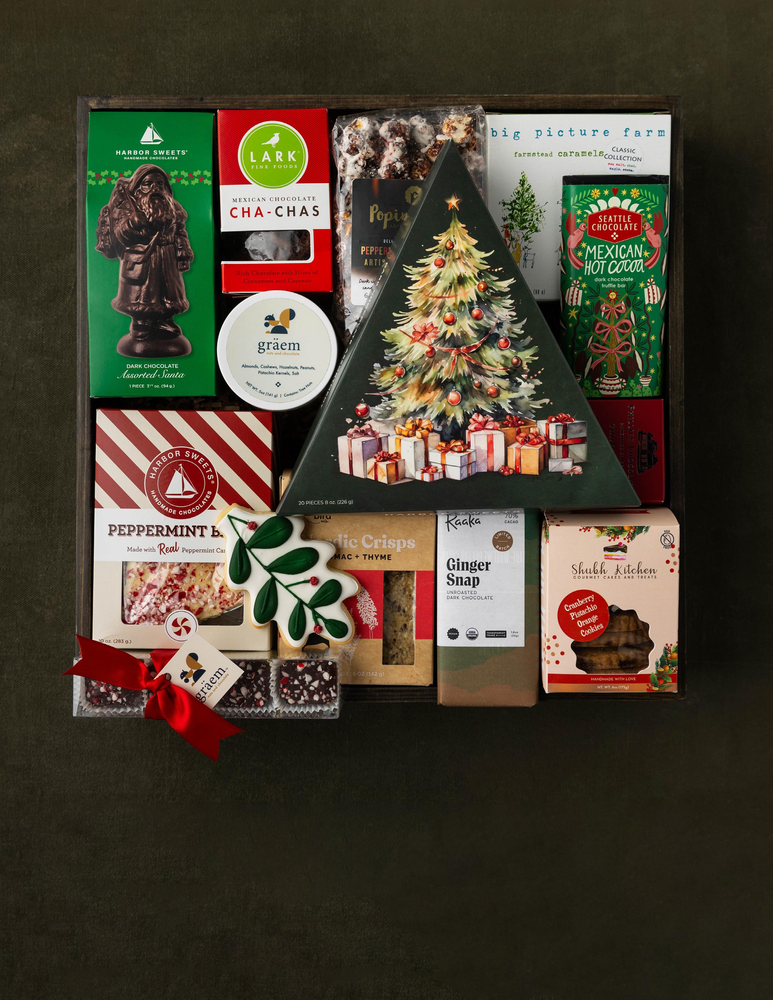 Gifting a group? Treat them to sugar, spice, and everything nice this holiday season. This tempting display features an incredible array of treats, including a box of assorted chocolates and peppermint bark from Harbor Sweets, a duo of peppermint truffles and mixed nuts from Gräem, Mexican chocolate cha-chas from Lark, Mexican hot cocoa bar from Seattle Chocolate, and peppermint hot chocolate popcorn from Popinsanity. Also included are caramels from Big Picture Farm, ginger snaps from Raaka, grain crisps from Hungry Bird, cranberry, pistachio, and orange cookies from Shubh Kitchen, and a sugar cookie from Three Hundred Fifty. All displayed in a large gift crate.