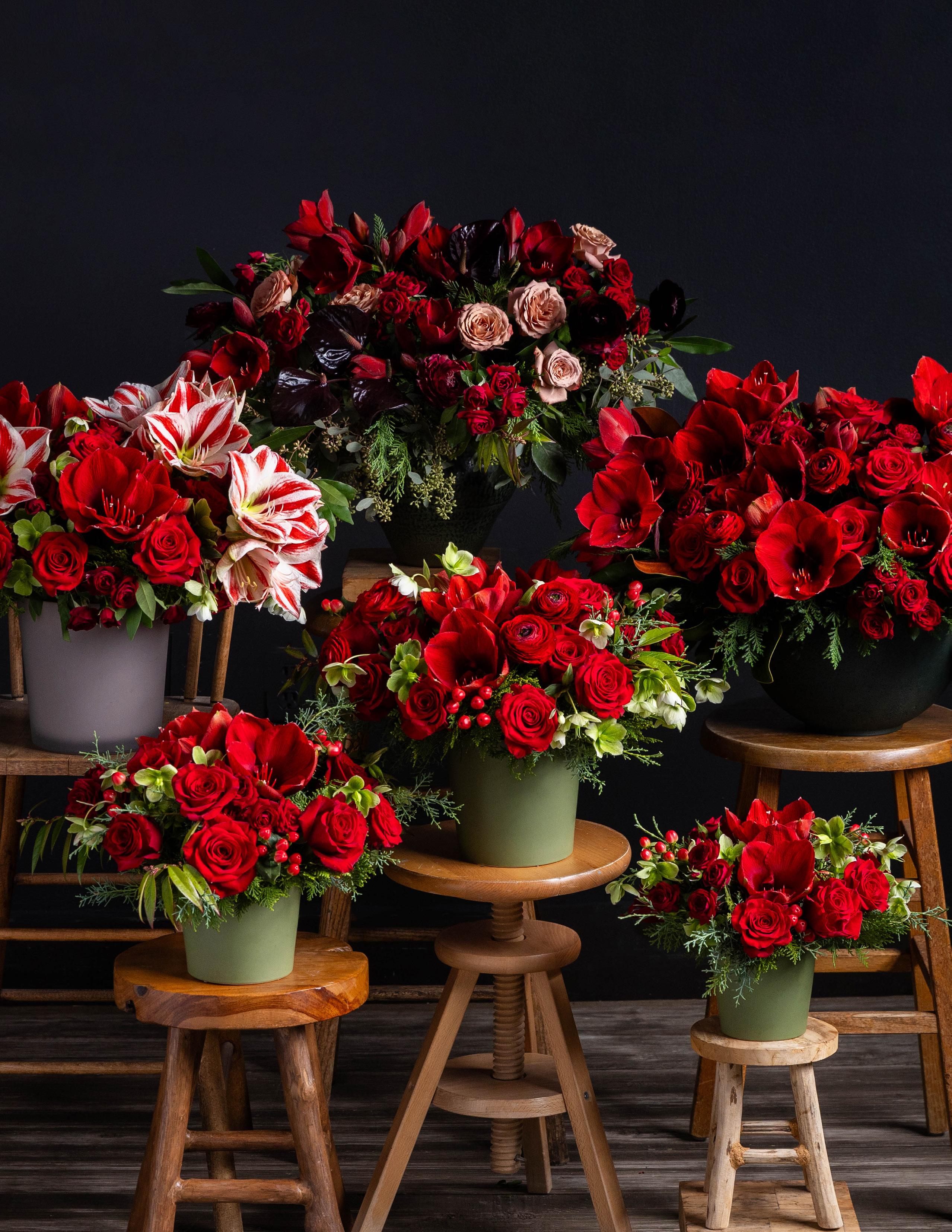 Experience pure holiday magic with this showstopping design. Featuring a fresh take on classic holiday hues with cardinal-colored roses, spray roses, and amaryllis alongside dusty pink ʻcappuccinoʼ roses and deep maroon anthurium and ranunculus. Finished with richly-textured evergreens, seeded eucalyptus, and seasonal greenery in a textured keepsake pot.