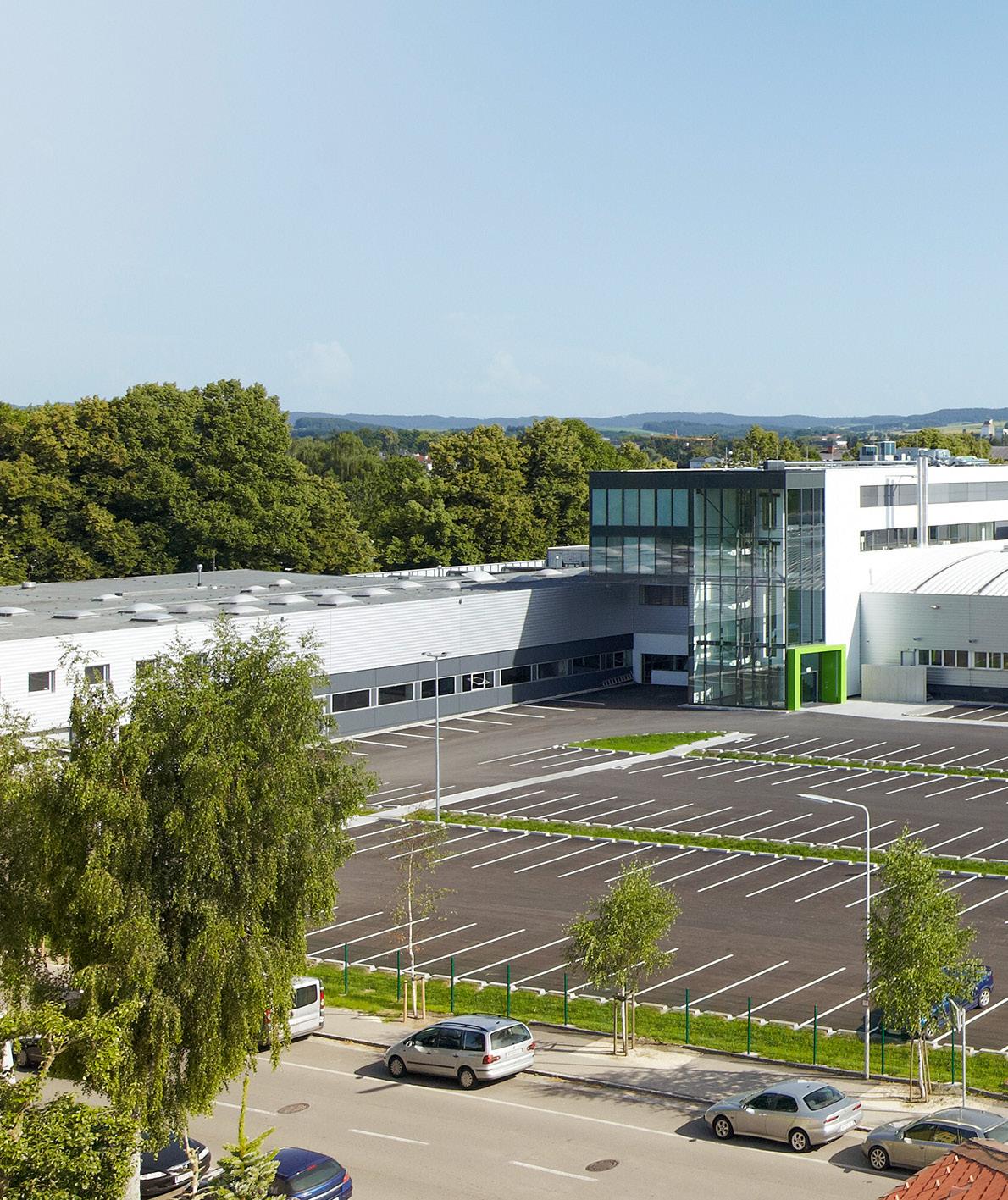 The offices and production halls at the location in the Solar Industrial Park in Mettmach draw green electricity from a photovoltaic system: all roofs are equipped with PV modules. Heating and cooling are provided by heat pumps. Of course, all light sources are based on energy-saving LED technology.