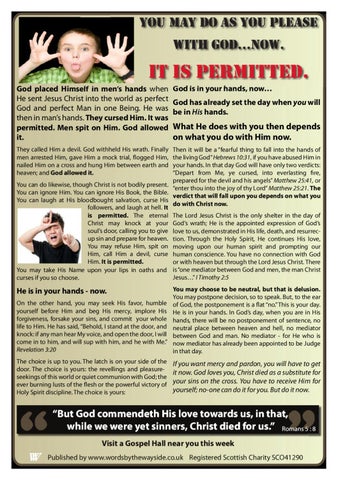 Then it will be a “fearful thing to fall into the hands of the living Godâ€? Hebrews 10:31, if you have abused Him in your hands. In that day God will have only two verdicts: “Depart from Me, ye cursed, into everlasting fire, prepared for the devil and his angelsâ€? Matthew 25:41, or You can do likewise, though Christ is not bodily present. “enter thou into the joy of thy Lordâ€? Matthew 25:21. The You can ignore Him. You can ignore His Book, the Bible. verdict that will fall upon you depends on what you You can laugh at His bloodbought salvation, curse His do with Christ now. followers, and laugh at hell. It is permitted. The eternal The Lord Jesus Christ is the only shelter in the day of Christ may knock at your God’s wrath; He is the appointed expression of God’s soul’s door, calling you to give love to us, demonstrated in His life, death, and resurrecup sin and prepare for heaven. tion. Through the Holy Spirit, He continues His love, You may refuse Him, spit on moving upon our human spirit and prompting our Him, call Him a devil, curse human conscience. You have no connection with God Him. It is permitted. or with heaven but through the Lord Jesus Christ. There You may take His Name upon your lips in oaths and is “one mediator between God and men, the man Christ Jesus‌â€? I Timothy 2:5 curses if you so choose.