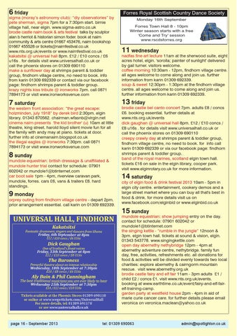 mundole equestrian: show jumping entry on the day. contact for schedule: 07901 602042 or mundole1@btinternet.com the singing kettle - “rumble in the jungle” 12noon & 3pm. elgin town hall. tickets at sound & vision, elgin. 01343 543778. www.singingkettle.com open day abernethy nethybridge 12pm - 4pm at abernethy adventure centre, nethybridge. family fun day, free, activities, refreshments etc. all donations for food & activities will be divided evenly towards two local charities: explore abernethy & cairngorm mountain rescue. visit www.abernethy.org.uk brodie castle fairy and elf fair 11am - 3pm adults £1 / child £2 / concs £1. visit www.nts.org.uk/events. booking at www.earthtime.co.uk/event/fairy-and-elf-fairelf-training-camp. garden party at westfield house 2pm - 4pm in aid of marie curie cancer care. for further details please email veronica on veronica.maclean@yahoo.co.uk