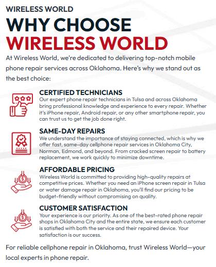 Looking for a reliable Cracked iPhone screen repair in Tulsa? Wireless World, located on S Memorial Dr, offers expert repairs at affordable prices. Whether you need a screen replacement, battery change, or other iPhone services, our skilled team ensures fast and professional solutions. Trust us to restore your phone’s functionality and appearance with high-quality repairs.