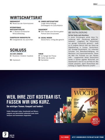 22 DIGITALISIERUNG Auf der Suche nach Anschluss In einem Schulzeugnis würde diese Formulierung wohl „Versetzung gefährdet“ bedeuten: „Insgesamt hat Deutschland nur geringe Fortschritte gemacht“, heißt es im jüngsten Bericht über den Stand der Digitalisierung in Europa. Deutschland, das Vorzeige-Industrieland, mit sinkenden Schulden und Rekordbeschäftigung, mit Wachstum und Exportunternehmen, denen die Welt ihre Produkte aus den Händen reißt – ausgerechnet dieses Deutschland landet in Sachen digitaler Wirtschaft und Gesellschaft in der EU nur auf Platz elf. Was müsste passieren, damit Deutschland den Aufstieg zur Gigabit-Ökonomie schafft?