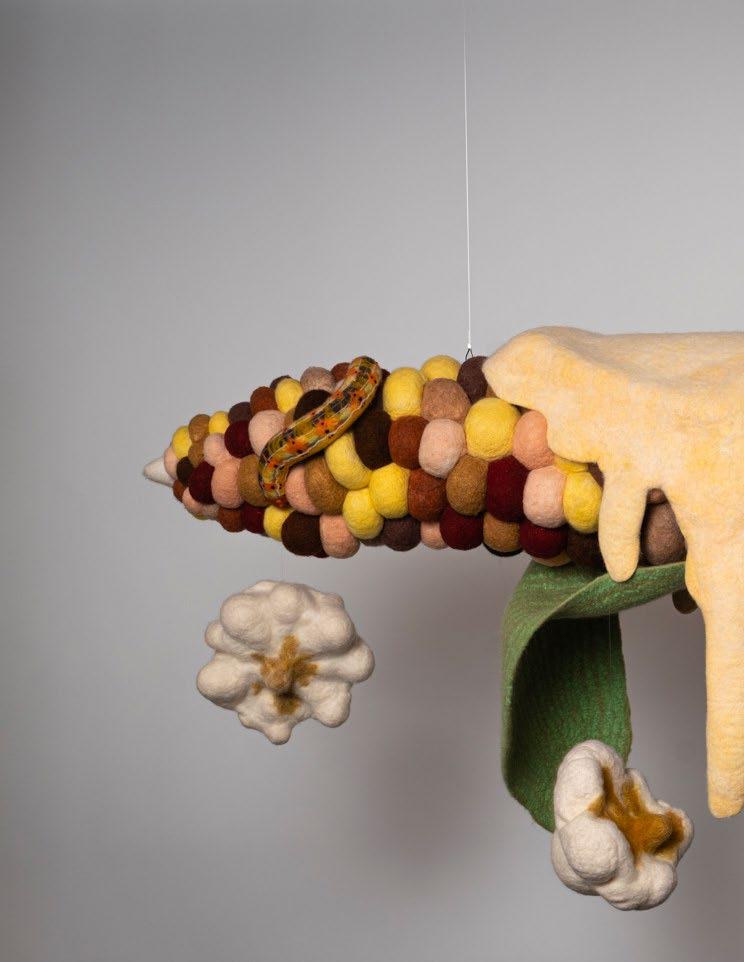 This installation piece hangs from the ceiling, depicting a large cob of glass gem corn, melting butter pat, corn silk worm and popped corn kernels. It is a statement about global warming, but was also born of a time of civil and political unrest, causing a lot of internal turmoil for me. So, I think my influences are greatly born of my internalizing experiences that need to get out.
