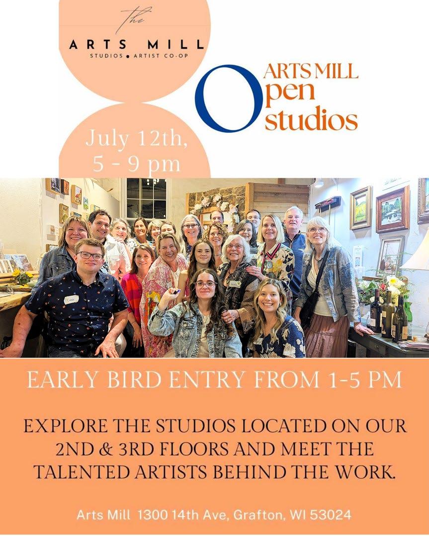 Join us for the 2nd Open Studios at the Arts Mill on July 12, 2024, from 5 pm to 9 pm. Chat with artists, explore art, enjoy free snacks, and more!