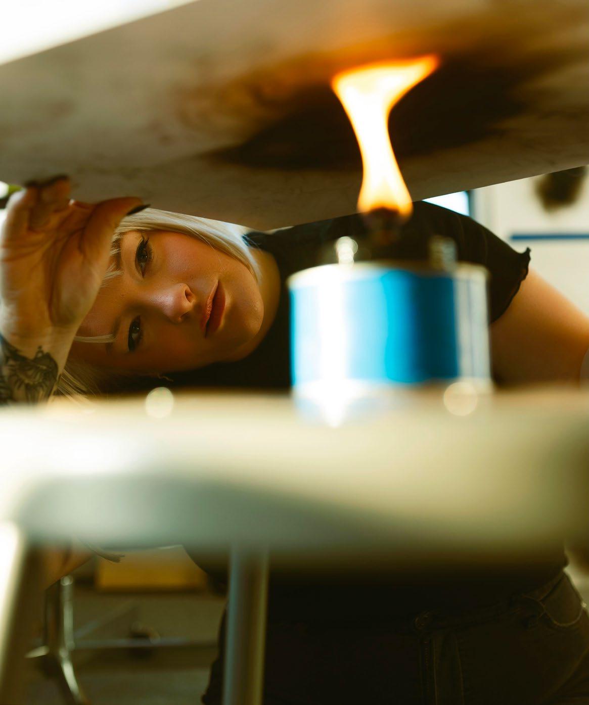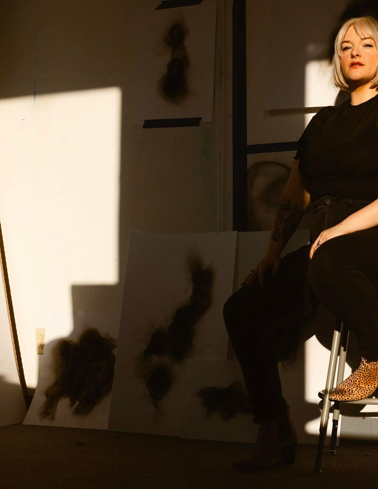 Fire painting, also known as fumage, is an unpredictable method. I hold a flame to a thick paper surface and allow the soot to collect there, creating an organic, swooping shape. From this point I can either keep the abstraction as it is, dig in with my paintbrushes and erasers, or wipe it off and start over. This process has taught me to be less precious with my art experiments.