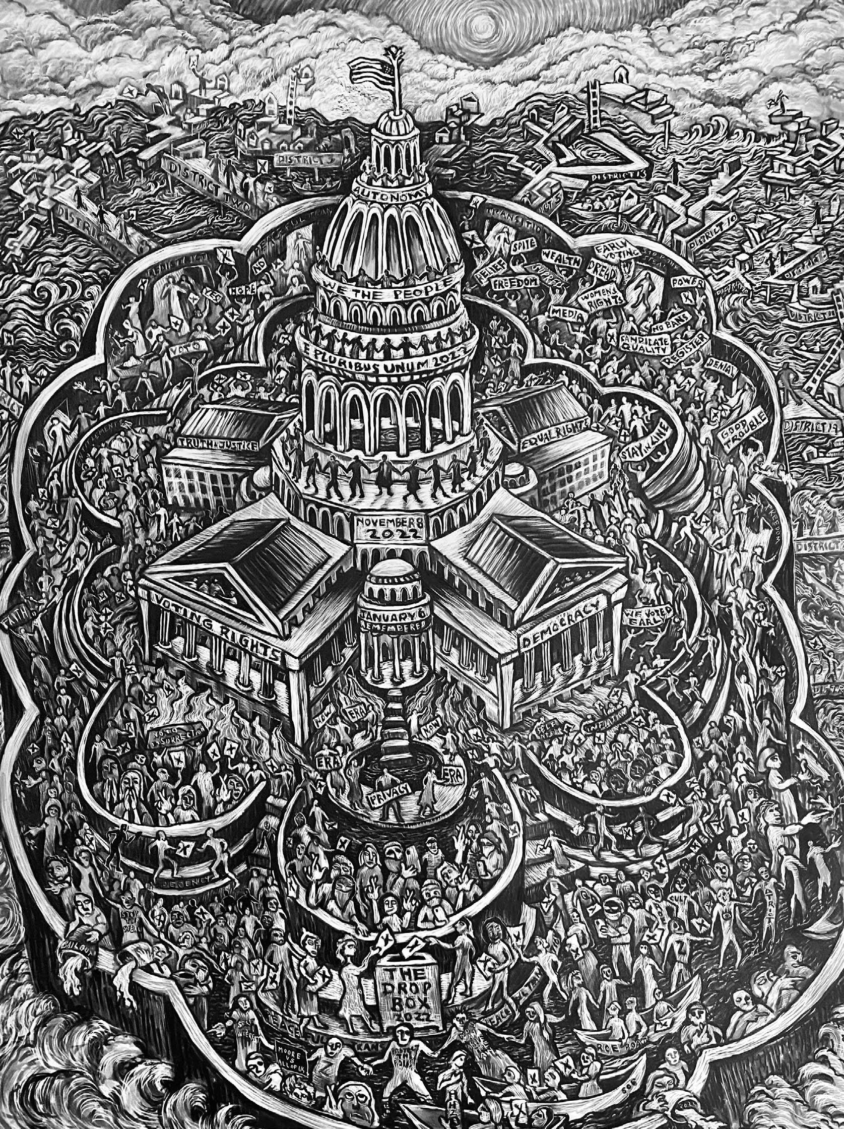 I hope that viewers take time to carefully look at details and spend some time away from their daily concerns. My work is meant to share complexity and a slow analysis of forms that are interlocking in unusual way. I hope that people slow down and consider the topics, materials or themes of my work. I hope that people engage and scan work to find out how the ideas contained are integrated and connected. In issues like banned or challenged books my goal is for people to stop and consider why and how certain books are chosen for removal based upon a defined connected to freedom of expression.