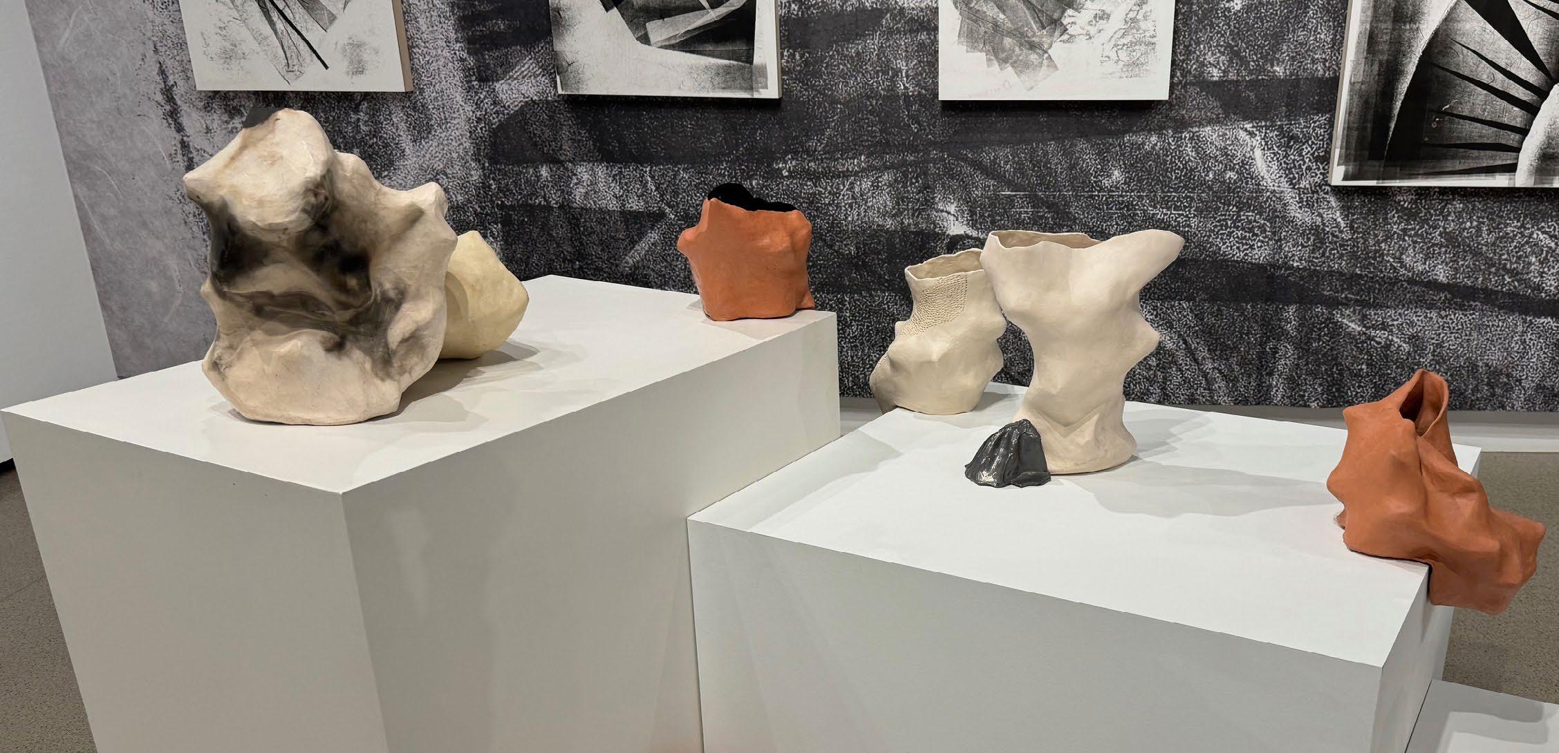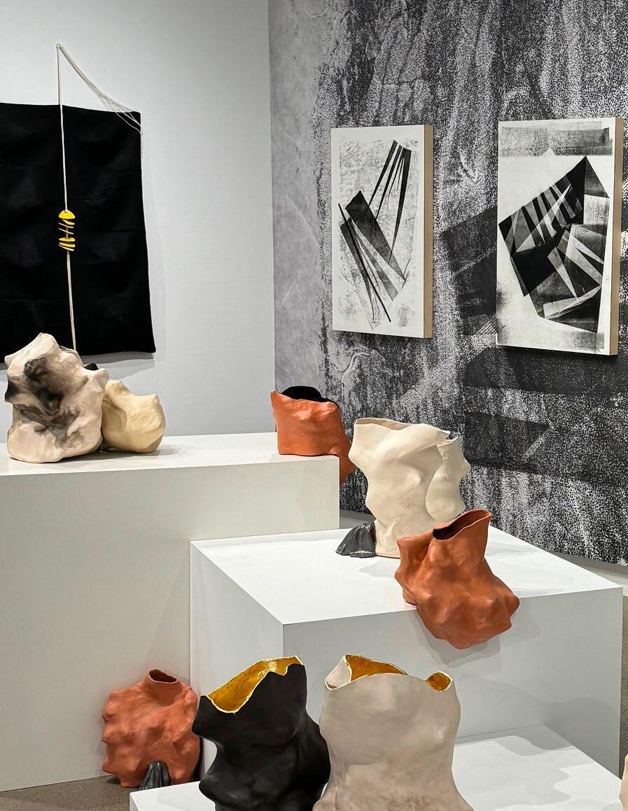 My MFA exhibition this past summer is called "Walking the Gaze". Using ceramics, monoprint and fiber techniques, this body of work explores a common women's clothing construction technique, "darts" and how it darts have been used to confine and restrict how a woman's body moves and explores the world around her. By taking the dart and placing it in different materials like ceramics and monoprints it exposes its limitations and its possibilities of re-imagination. This work is deeply rooted in subjectivity and all the commonly accepted systems of control around us,