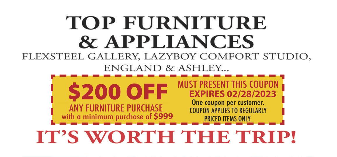 IT’S WORTH THE TRIP! Over 20,000 square feet of home fashion to fit your family’s needs. COME SEE WHAT’S NEW FOR FALL! Visit our online virtual showroom for the best selection of the latest styles in furniture and appliances in the North Country! Welcome to Northern New Hampshire’s LARGEST FURNITURE and APPLIANCE showroom! Our nine-level warehouse helps to ensure availability, and we carry many manufacturers in our large showroom. An in-house team of full-time service professionals guarantees we stand behind what we sell. ROUTE 16 between Berlin & Gorham, NH • 603-752-5212 WE DELIVER WITHIN 100 MILES WWW.TOPFURNITURE.COM • MON - FRI 9-6, SAT 9-5 & SUN 11-4 WE DELIVER WITHIN 100 MILES!