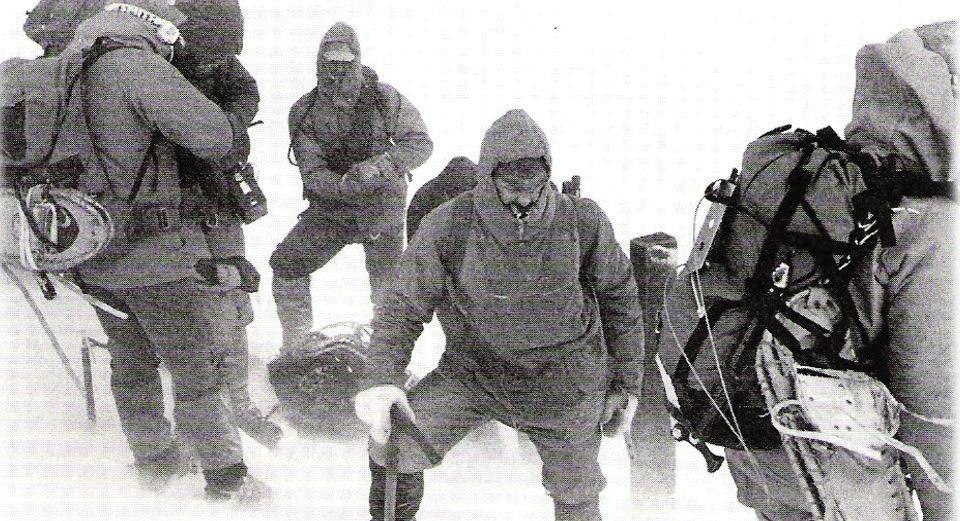 From left to right, Alex McKenzie, Bob Monahan, Joe Dodge, and Sal Pagliuca made up the first Observa tory crew to spend an extended time atop the Northeast’s highest peak.