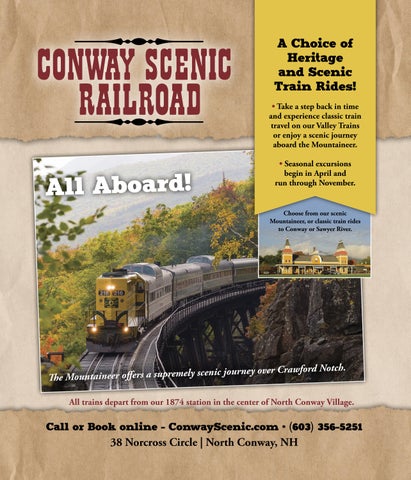 All Aboard! The Mountaineer offers a supremely scenic journey over Crawford Notch. Call or Book online - ConwayScenic.com • ( 603) 356-5251 38 Norcross Circle | North Conway, NH A Choice of Heritage and Scenic Train Rides! • Take a step back in time and experience classic train travel on our Valley Trains or enjoy a scenic journey aboard the Mountaineer. • Seasonal excursions begin in April and run through November. All trains depart from our 1874 station in the center of North Conway Village. Choose from our scenic Mountaineer, or classic train rides to Conway or Sawyer River.