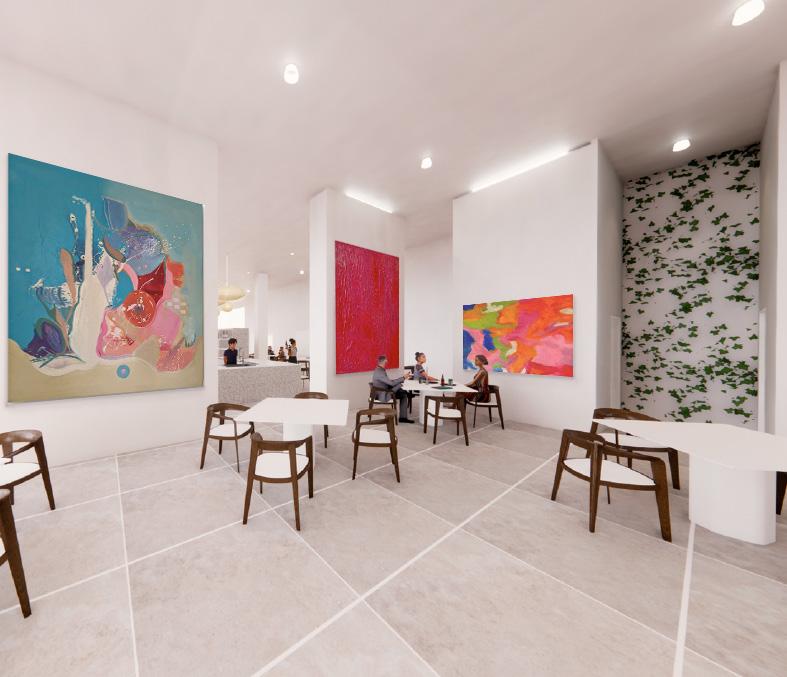 This waiting room separates the event and demonstration kitchens from the main dining area with a central location adjacent to the public restrooms. Nestled conveniently next to the reception desk, one of the initial spaces visitors will notice boasts a thoughtfully designed seating area. This serene corner, perfectly positioned near the public restrooms and the inviting northern dining area, provides a welcoming haven for guests as they await their tables or pickups. Immersed in the soothing ambiance of Mission Fresh, this area is more than just a waiting spot; it offers a cozy refuge where patrons can relax and savor the atmosphere, surrounded by subtle décor that echoes the vibrant spirit of the establishment.