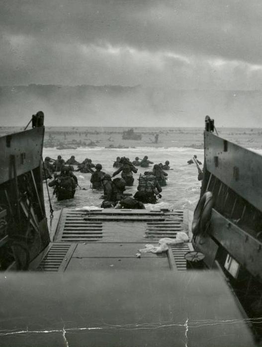 Chief Photographer's Mate Robert F. Sargent, United States Coast Guard (USCG), took this shot of 1st Infantry Division troops disembarking from a Coast Guard-manned landing craft, vehicle, personnel (LCVP) on the morning of June 6, 1944, at Omaha Beach. (National Archives)