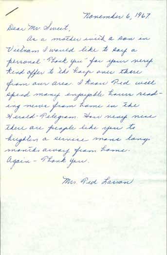 Later, Sweet began receiving letters from the soldiers and sailors themselves. They thanked Sweet with sentiments like, “I appreciate hearing from home and the best way is from your Mother and from the newspaper,” and, “It is one of the best gifts I have received during my tour here in Viet Nam.” These thank you letters show the vital importance of feeling