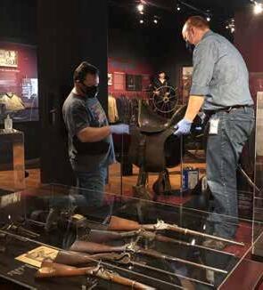 Curator of Exhibits Greg Krueger (left) reinstalls Col. Harnden’s saddle with the help of Curator of History Kevin Hampton after the saddle returned from a conservator where it was cleaned and repaired.