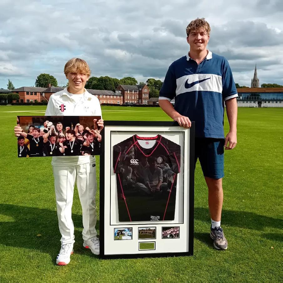 Old Withamian Felix Starkey (OW ’18) has donated to Witham Hall his Oakham School match shirt from the 2023 U18 National Schools Cup win he co-captained at Twickenham in March 2023. Felix presented his framed shirt, as well as photos of his rugby days playing for both Witham Hall and Oakham School, to Witham Hall Cricket Captain, Oscar. Oscar accepted the framed shirt on Witham’s behalf after matches v Oakham this Trinity Term. There were four OWs in the triumphant Oakham squad last year and Witham is honoured to exhibit Felix’s match shirt to inspire pupils to work hard both on and off the pitch.