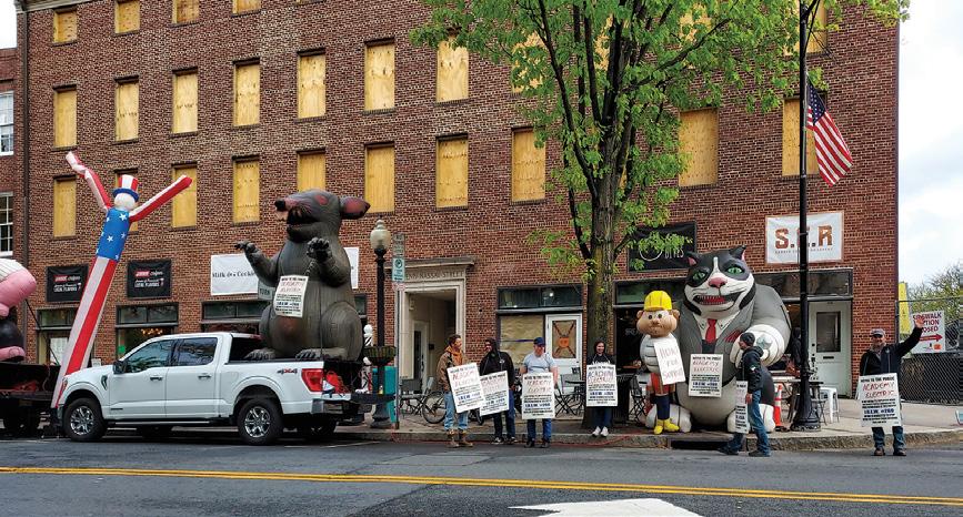 An inflatable giant rat, a pig, and a cat, along with a skinny Uncle Sam and an inflated image of a construction worker have towered over pedestrians and cars outside the Graduate Hotel under construction at the corner of Chambers and Nassau Streets.
