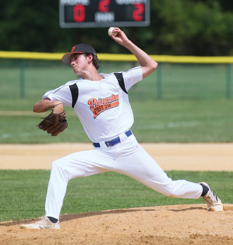 FINAL DELIVERY: Princeton Post 218 American Legion baseball player Travis Petrone fires a pitch in recent action. Last Wednesday, Post 218 fell 11-3 to North Hamilton in the continuation of a game suspended from July 9 due to inclement weather to wrap up its 2023 season. Princeton ended the summer with a 3-19 record. (Photo by Frank Wojciechowski)