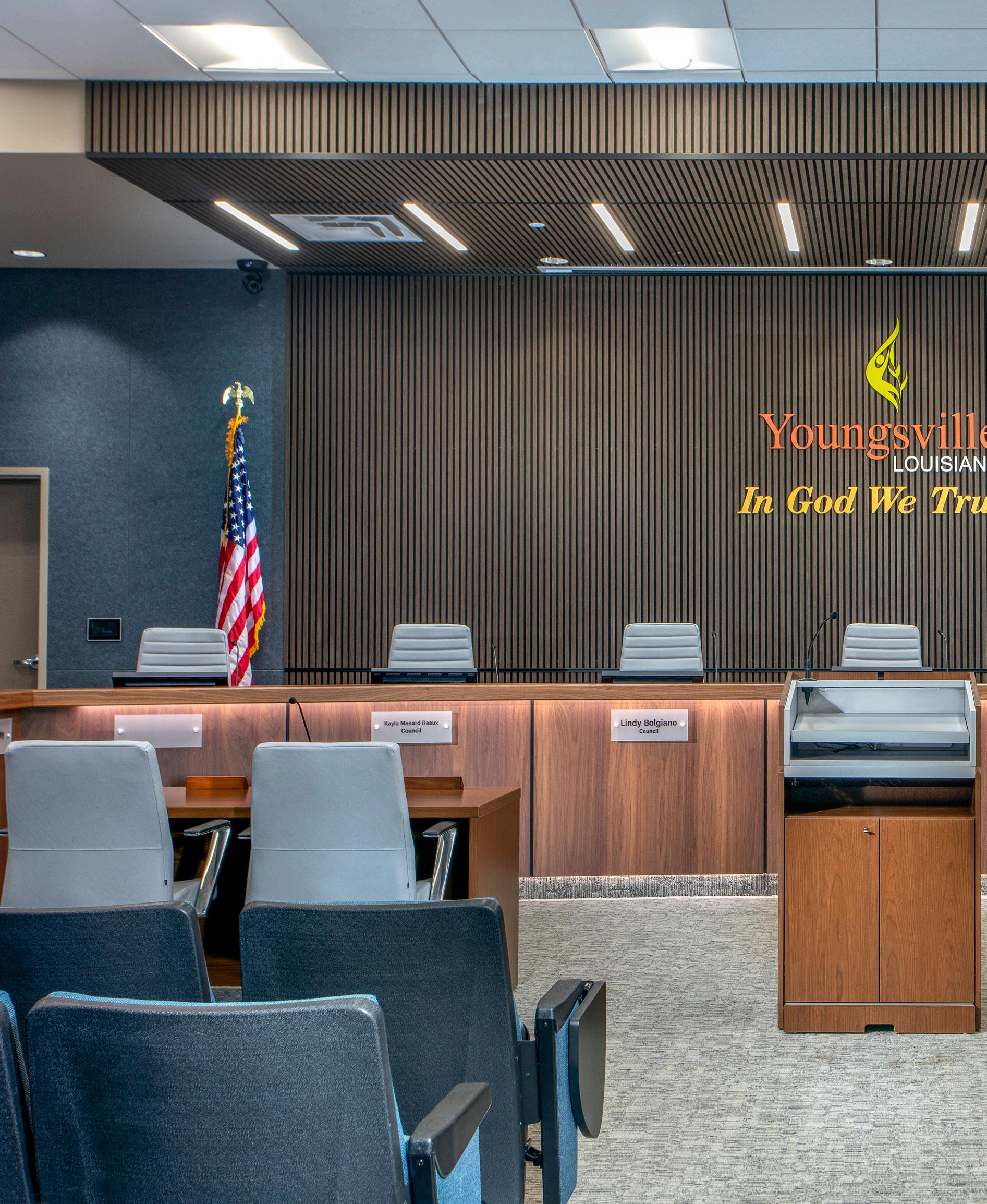 Within Studio was engaged to design the interiors of Youngsville’s new Municipal Complex, a 16,400-square-foot civic hub housing City Hall, Council Chambers, and Police Department facilities.