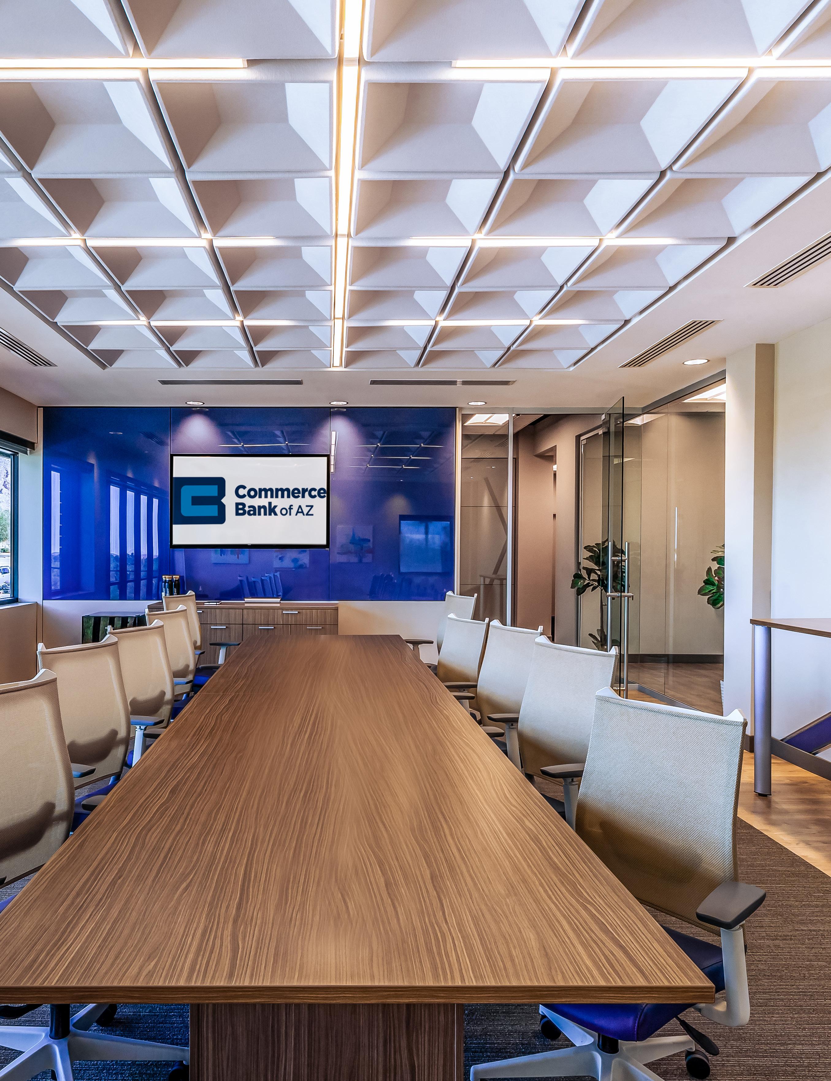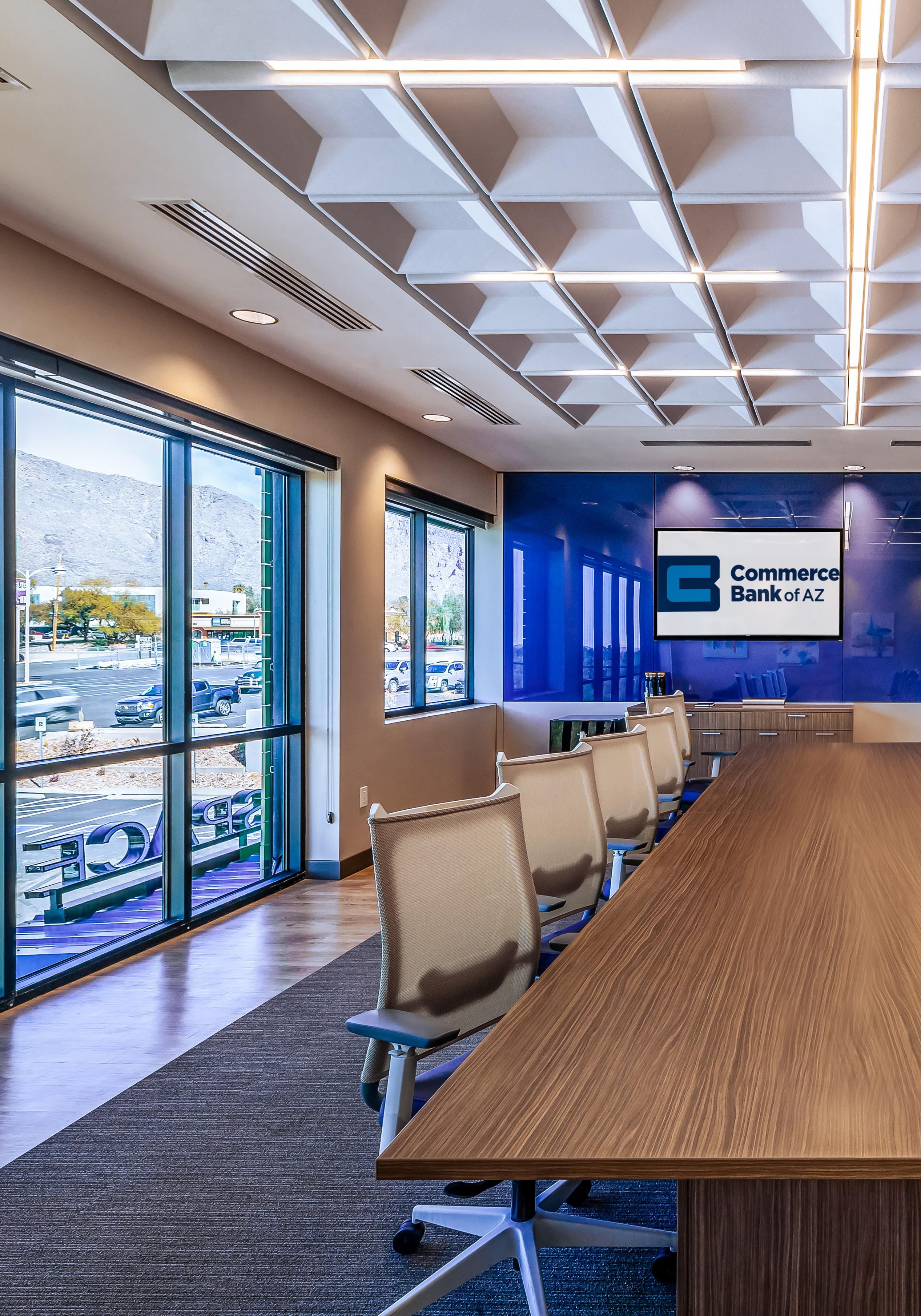Within Studio designed the corporate offices for Commerce Bank (now Southwest Heritage Bank), located at Two Oracle Place in Tucson. This tenant improvement project reimagined the workplace for modern banking operations, infusing the space with clarity, confidence, and brand-forward design. Inspired by the bank’s iconic blue, our interiors reflect trust, innovation, and a fresh sense of purpose. The result is a clean, uplifting environment that balances professionalism with warmth, supporting both focused work and collaborative culture.