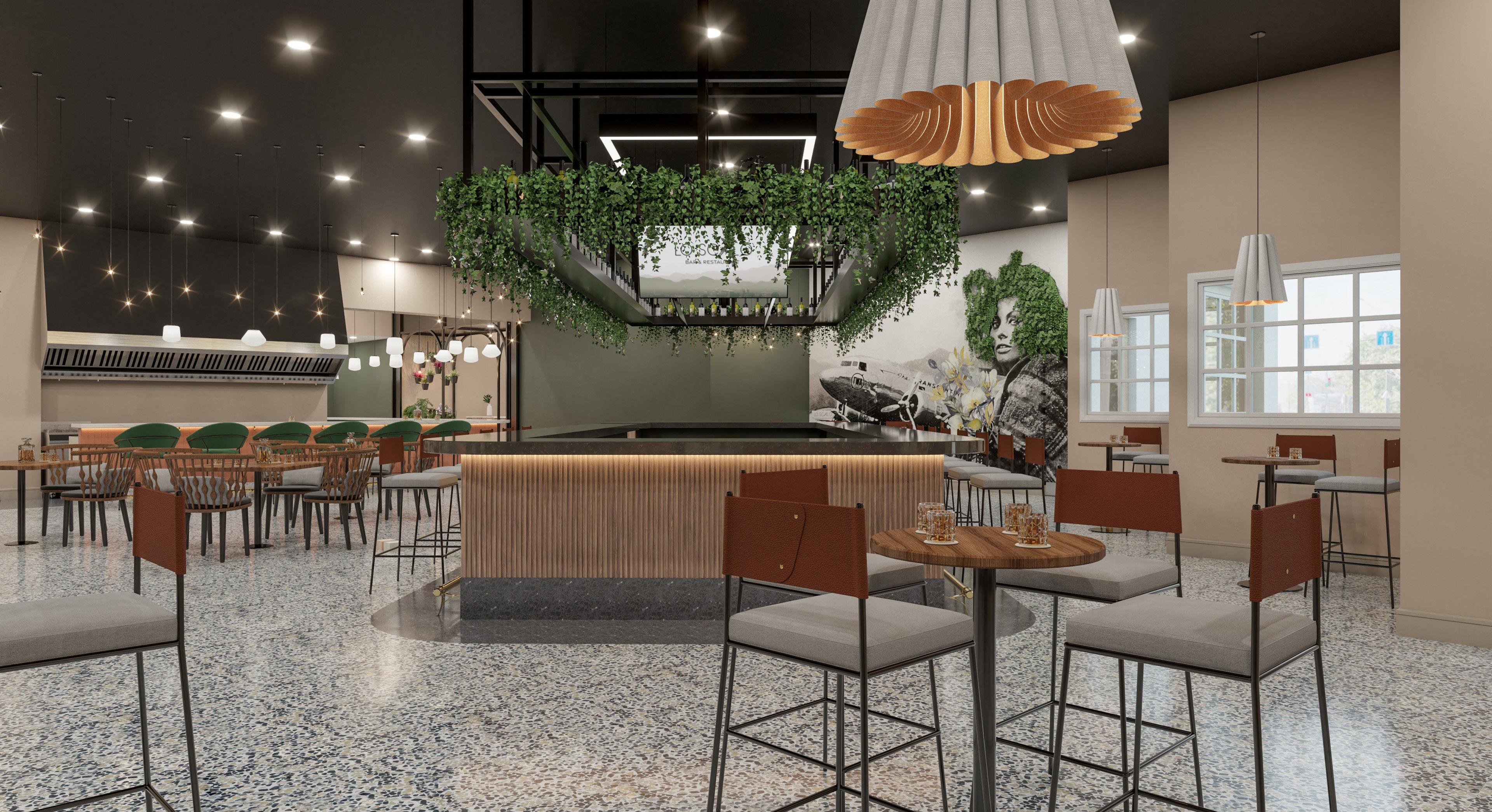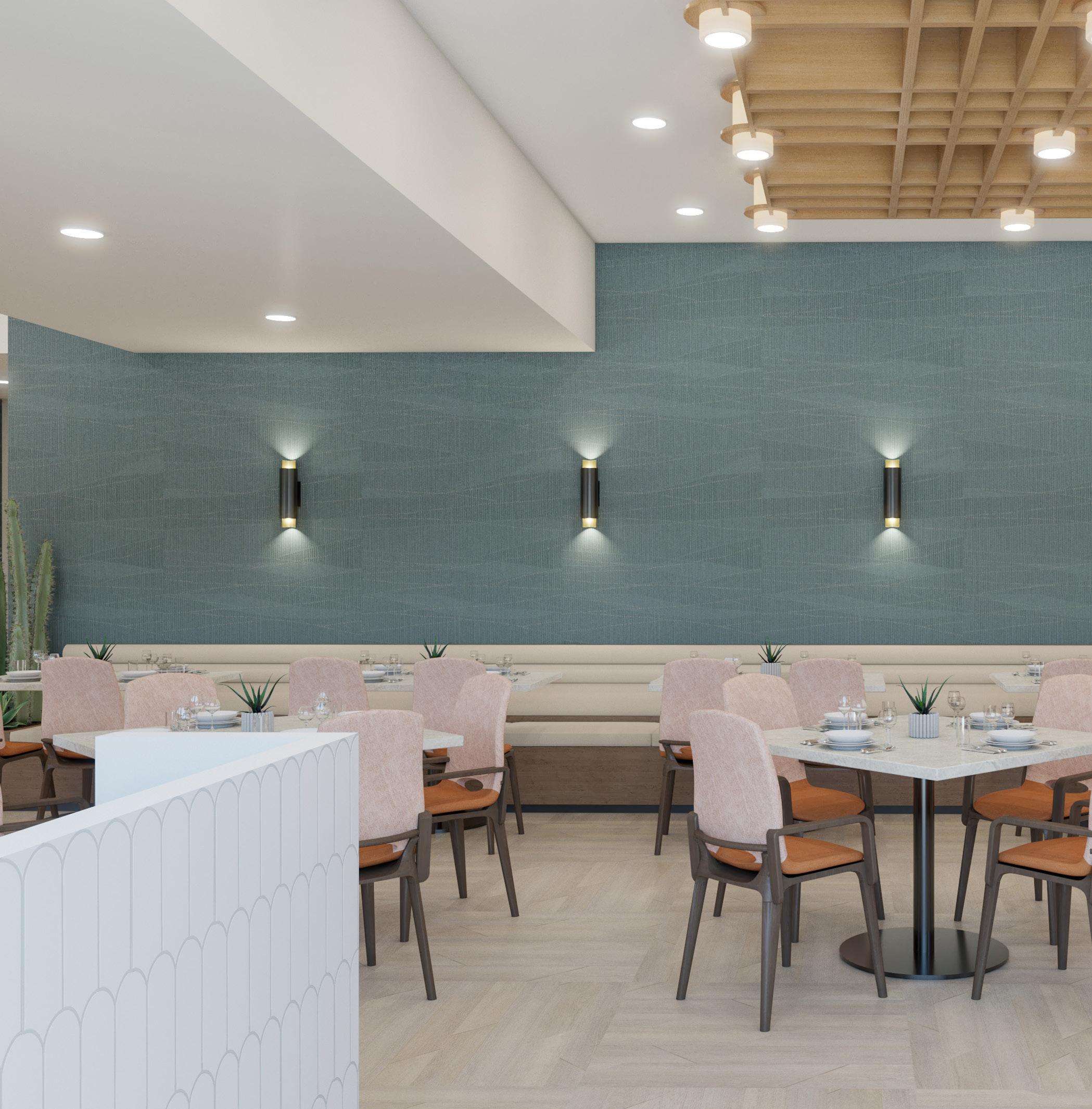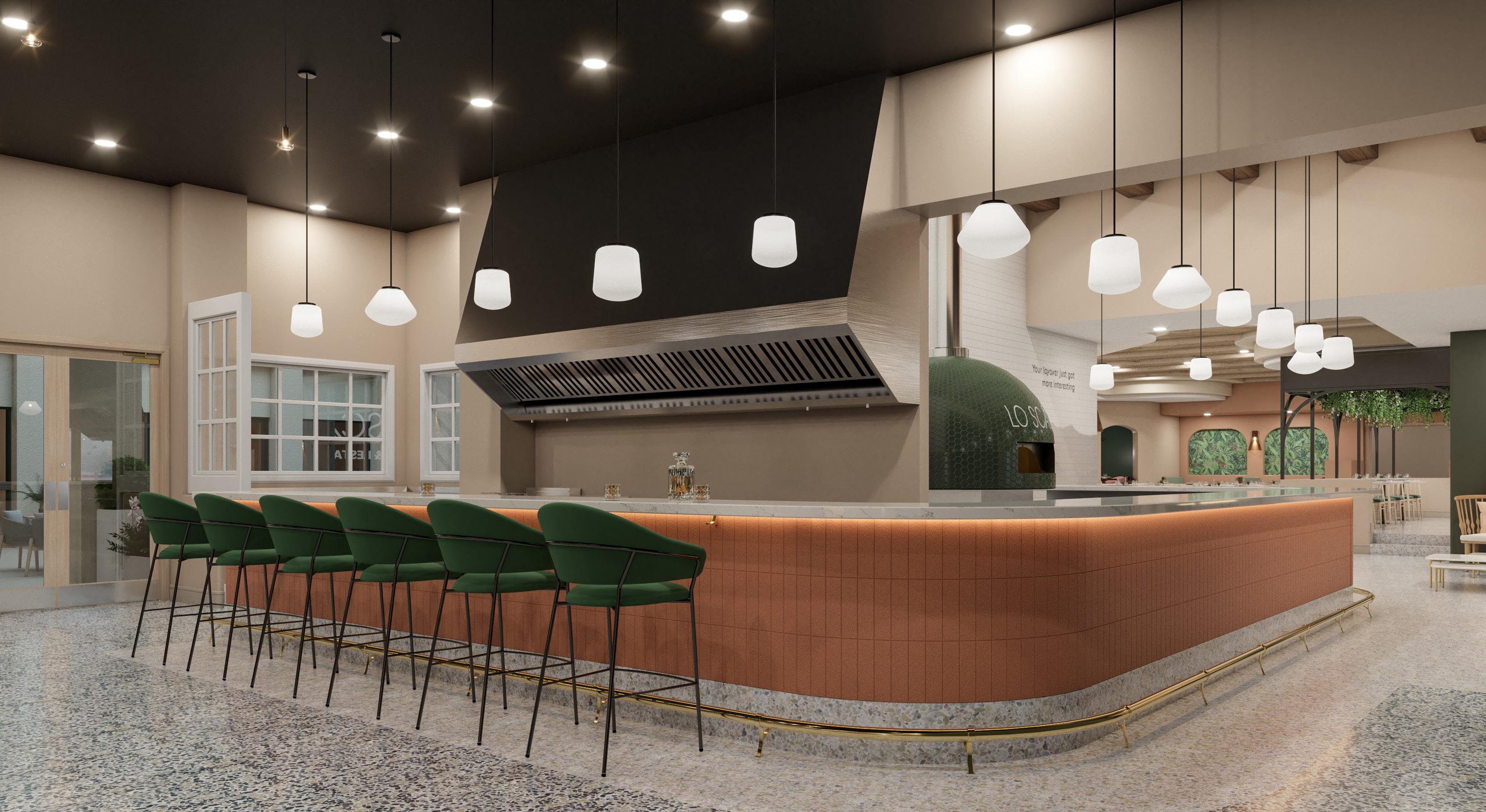 Inspired by bright desert mornings and citrus-infused palettes, the design celebrates rejuvenation, connection, and fresh ingredients. Natural light, warm woods, and pops of green create a welcoming flow from dining room to pizza bar, where a wood-fired oven anchors the space in comfort and craft.