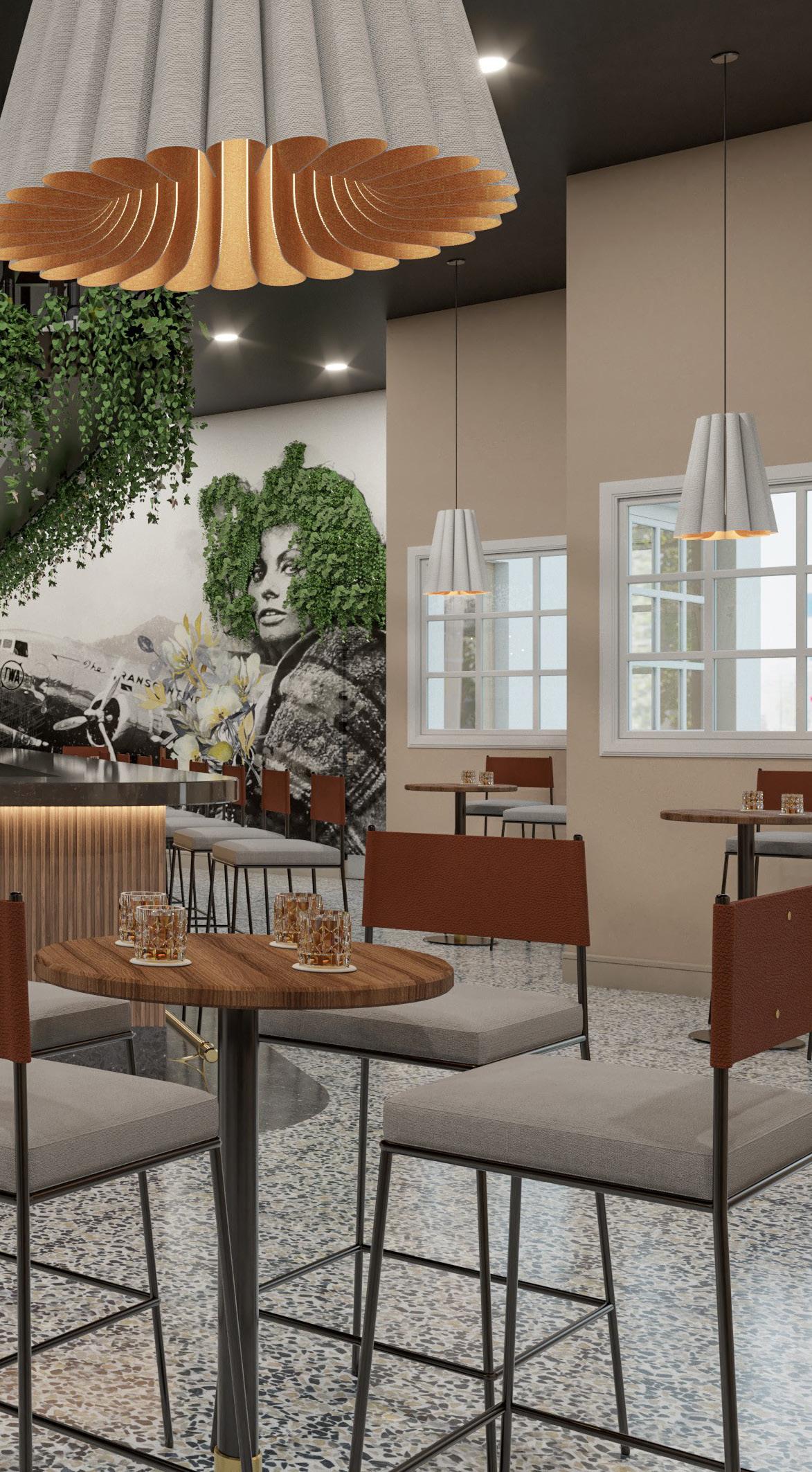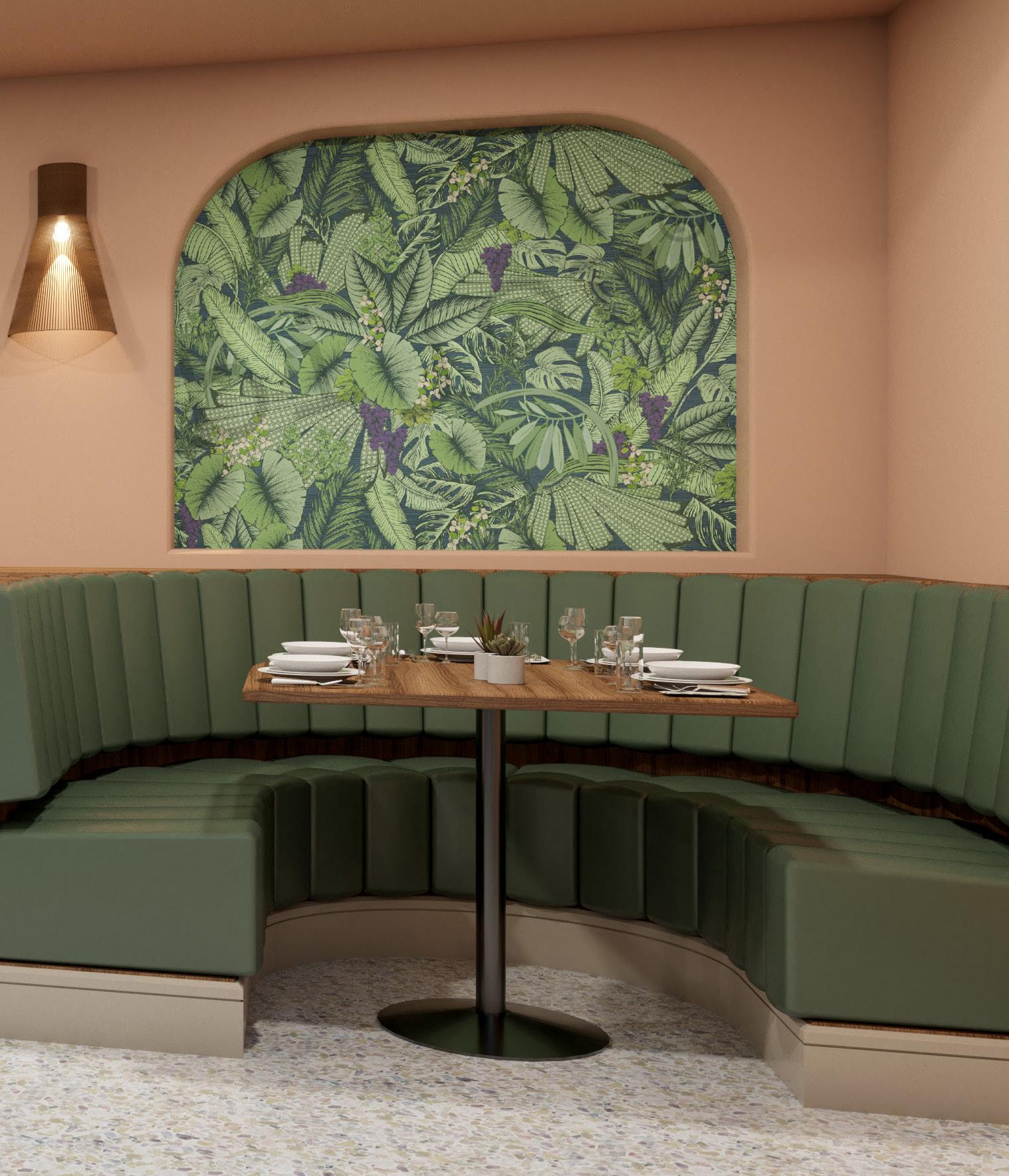From custom branded wallcoverings to living greenery, the space flows like a home: warm woods, open kitchens, and sun-washed patios echo the rhythm of slow meals and long conversations.