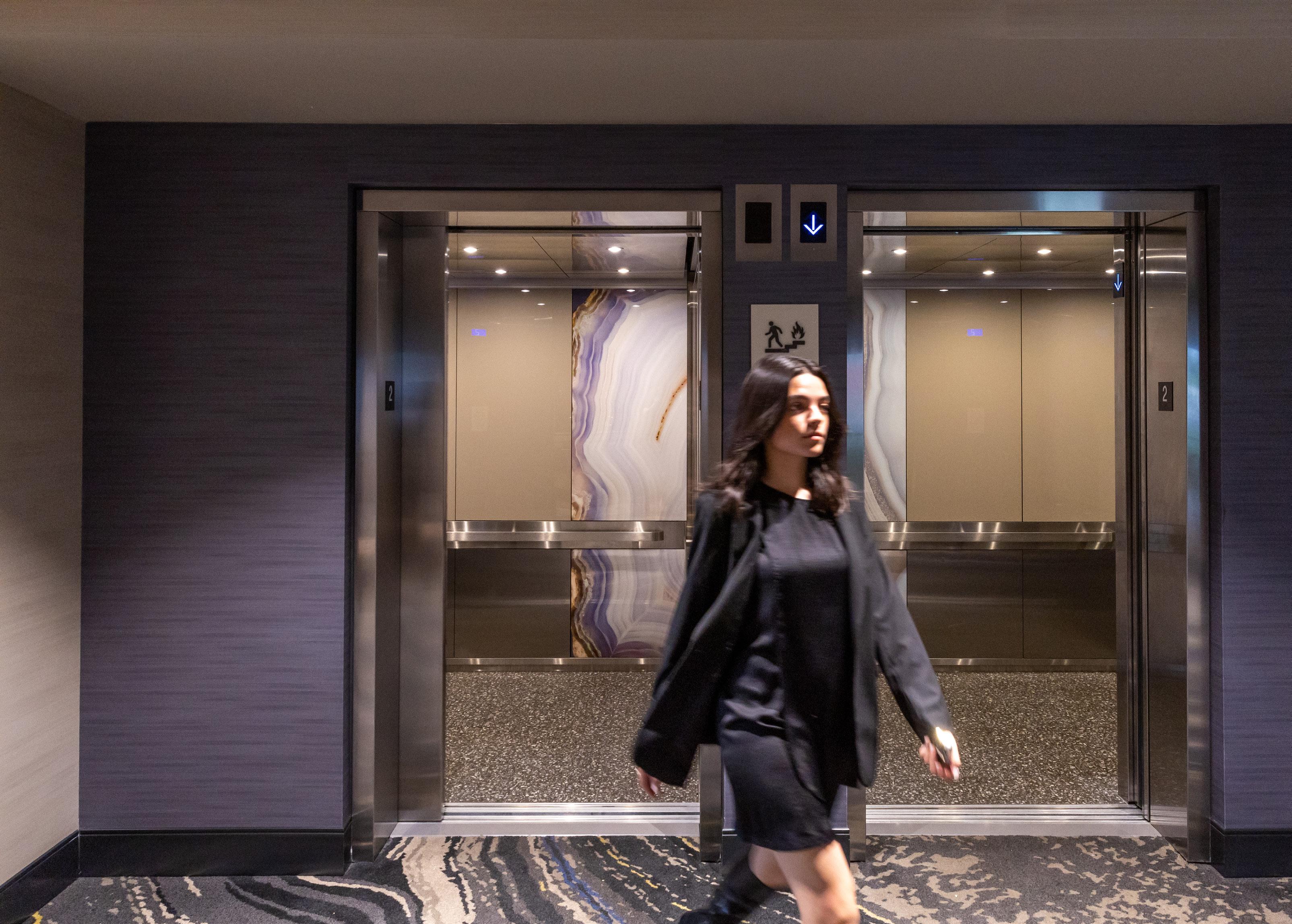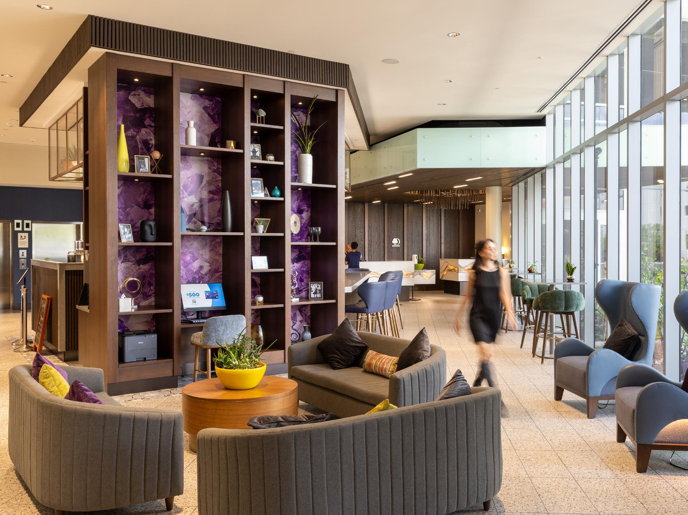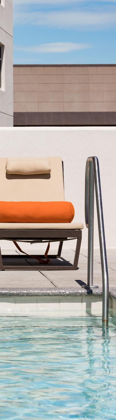 Public spaces were designed to transition easily between retreat and gathering. An elevated second-floor pool and fitness center create a quiet escape above the city, while flexible meeting and event areas support a range of guest needs connected to the adjacent convention center.
